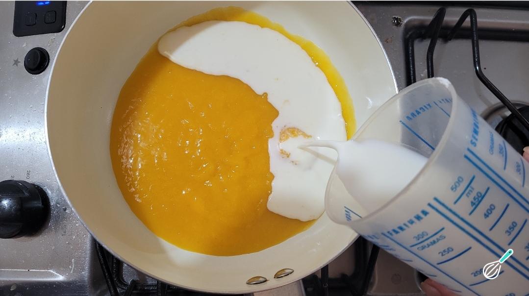 Na panela, coloque a polpa da manga já batida, adicione a mistura de leite com amido e misture bem.