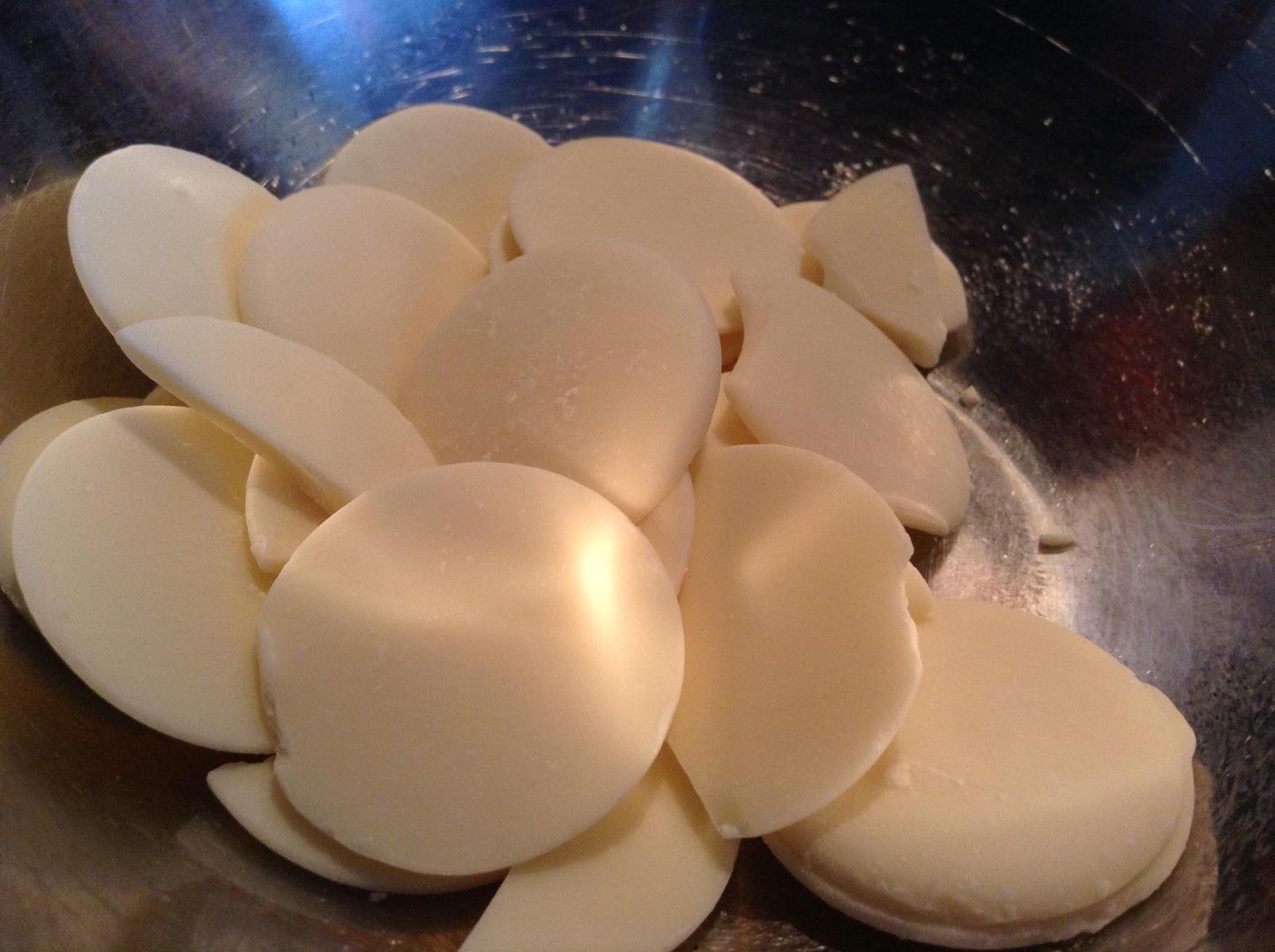 Coloque o chocolate branco para derreter no banho-maria ou no microondas. Para derreter o chocolate no microondas coloque esquentando em potência máxima e em ciclos de 30 em 30 segundos, retirando para mexer. Isso é muito importante para não sobreaquecer o chocolate e evitar que ele fique com gosto e consistência ruins.