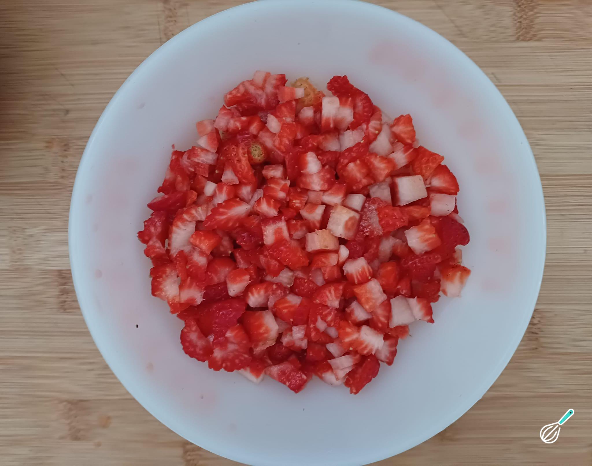 Depois de lavados e higienizados, retire as folhinhas e as pontas dos morangos e pique-os.