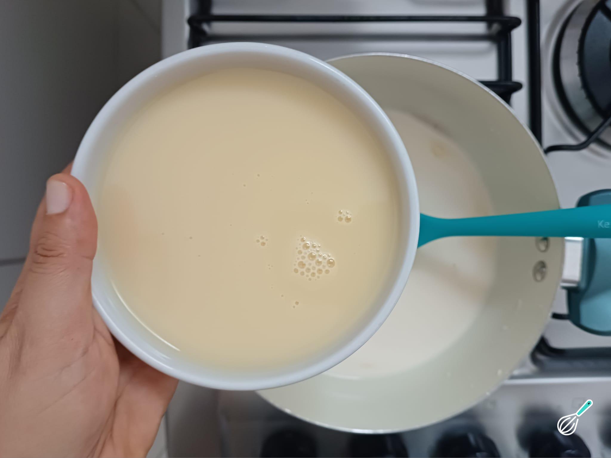 Numa panela, com o fogo desligado, misture o leite integral com o amido de milho e o leite em pó até ficar homogêneo, depois adicione o leite condensado.