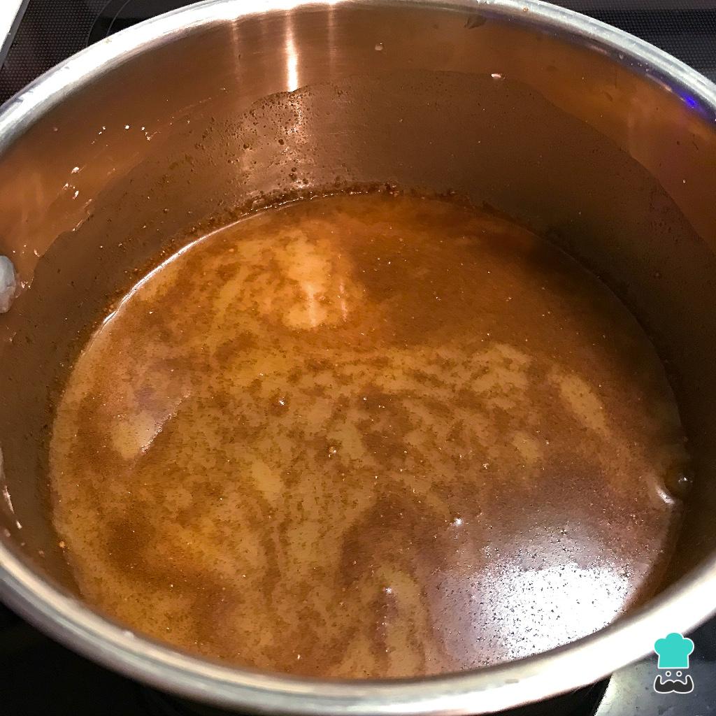 Depois misture o xarope de bordo com 1 xícara de água, a canela, a nós moscada e o amido até tudo estar bem diluído. Leve então ao fogo e mexa sempre até começar a engrossar.