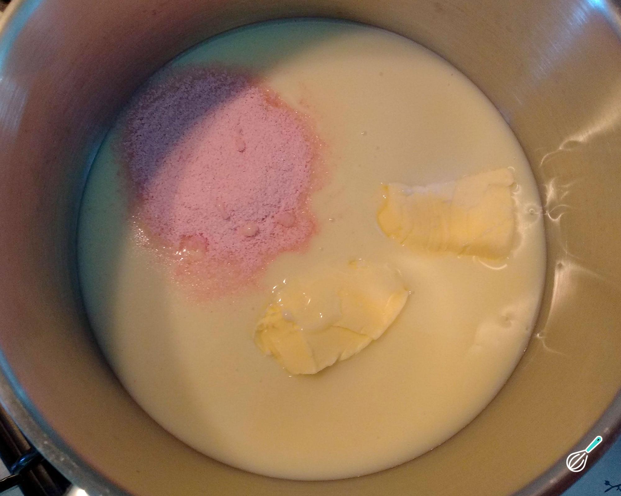 Coloque os ingredientes numa panela: o leite condensado, a gelatina em pó e a manteiga ou creme de leite. Misture e leve ao fogo médio.