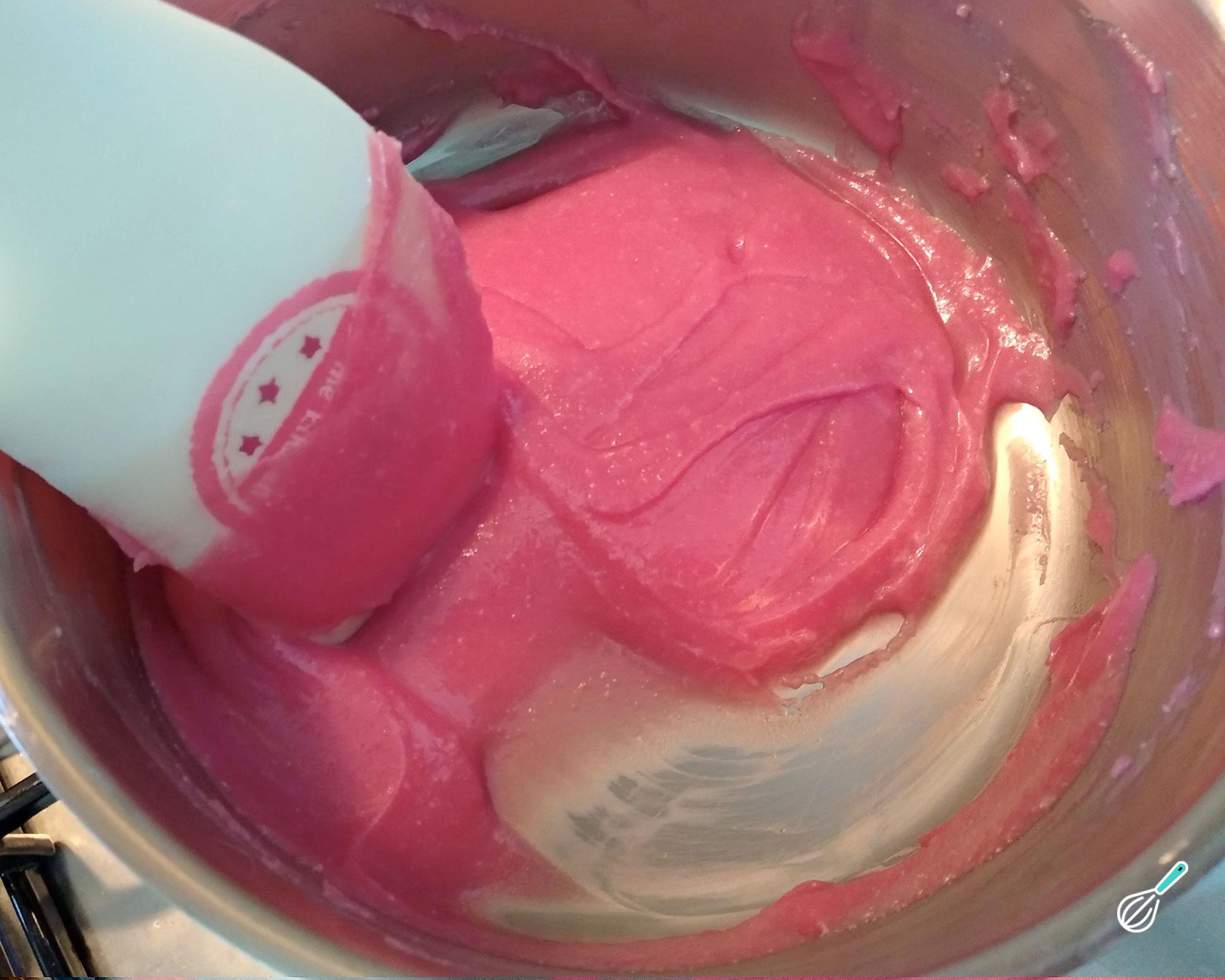 Fique mexendo por 10 minutos ou até conseguir uma consistência semelhante a brigadeiro mole. Nesse momento desligue o fogo e, se quiser uma cor mais intensa, coloque 1-2 gotas de corante alimentício vermelho e misture.