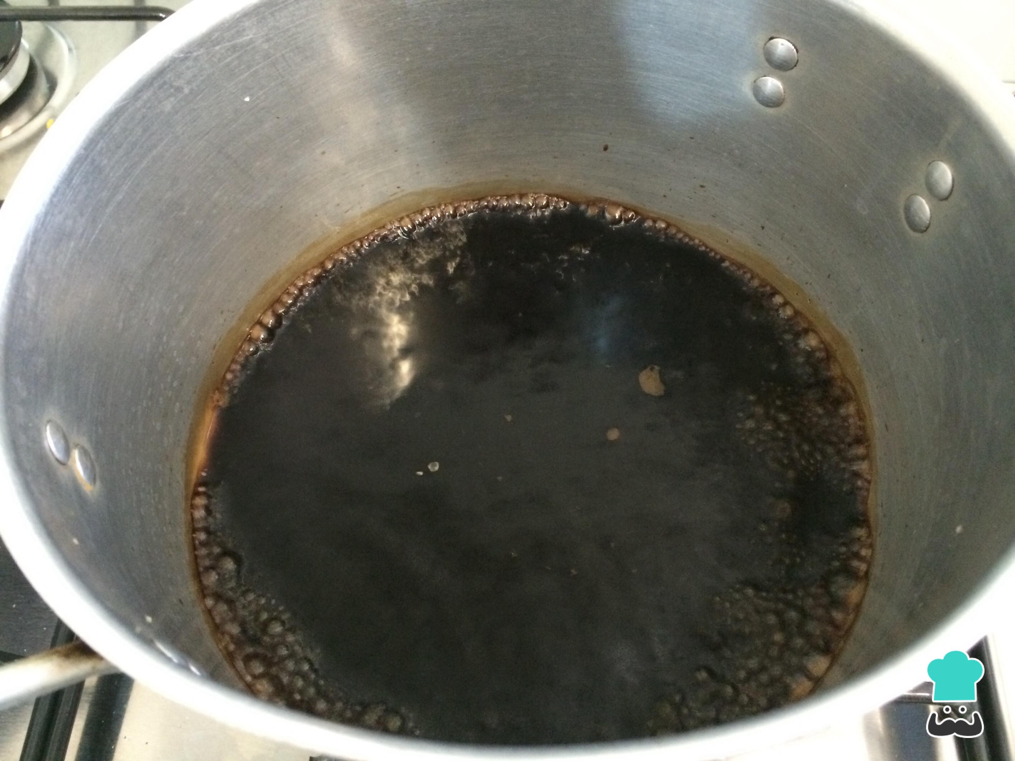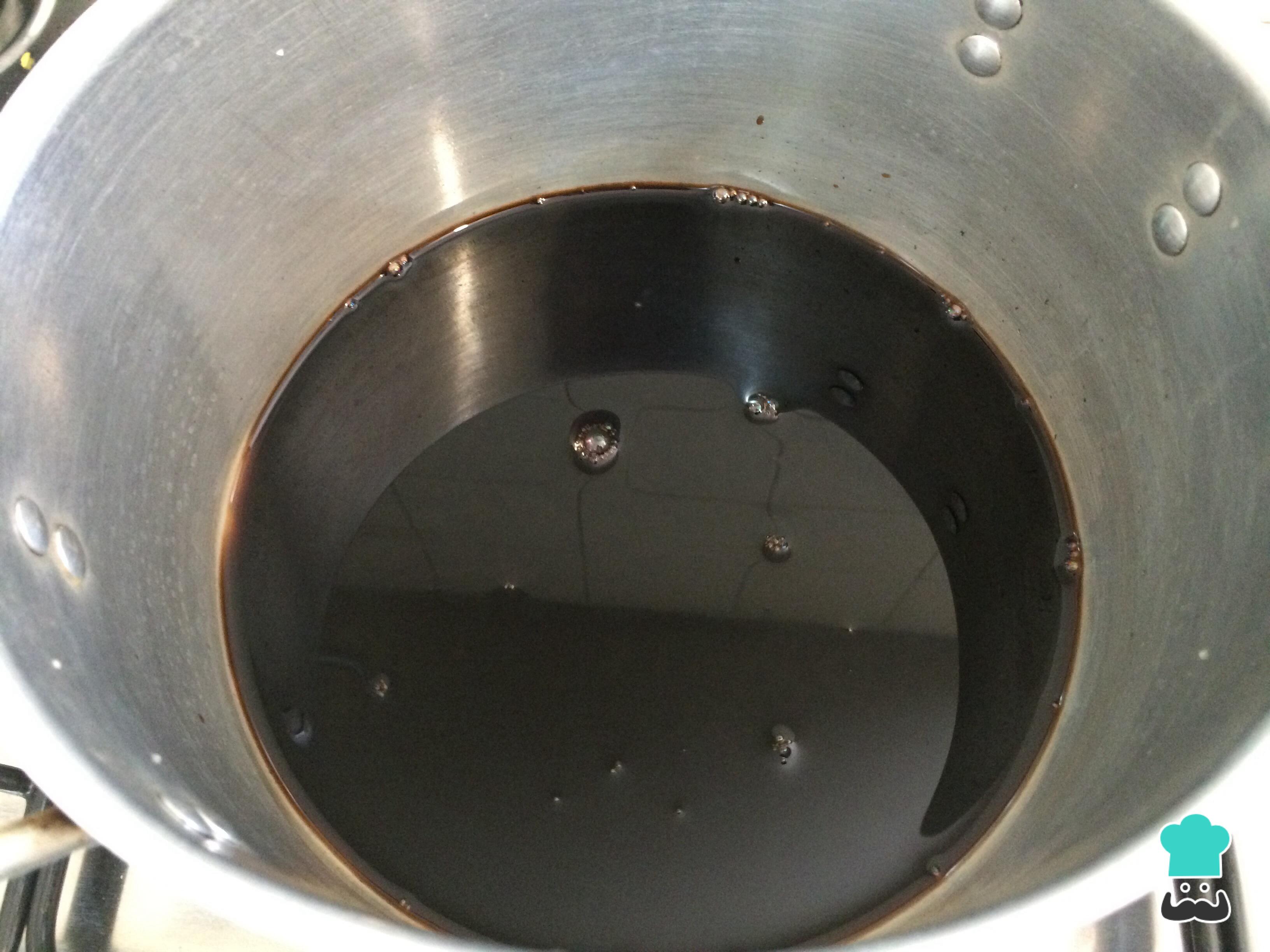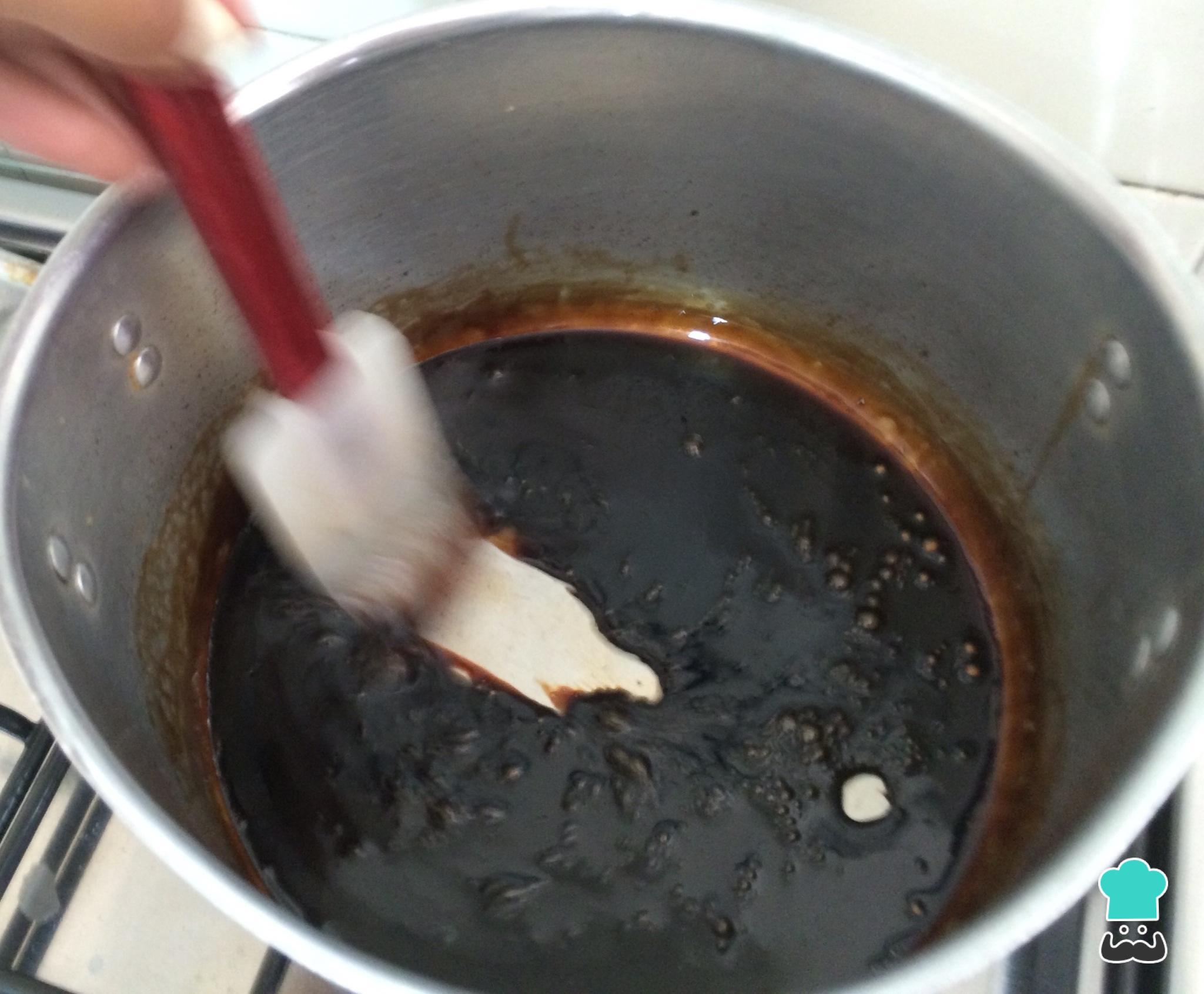 A redução estará pronta quando quando, ao passar uma espátula no fundo da panela, conseguir ver o fundo sem que o vinagre feche esse caminho de imediato. Desligue o fogo.