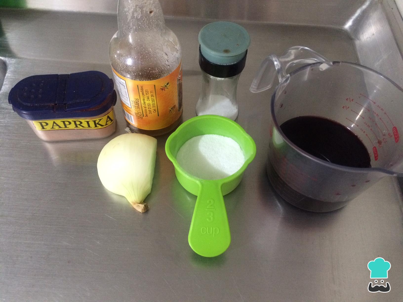 Em uma panela coloque o vinho com a cebola cortada em pedaços e a páprica. Deixe cozinhar em fogo baixo por 15 minutos, depois retire a cebola.