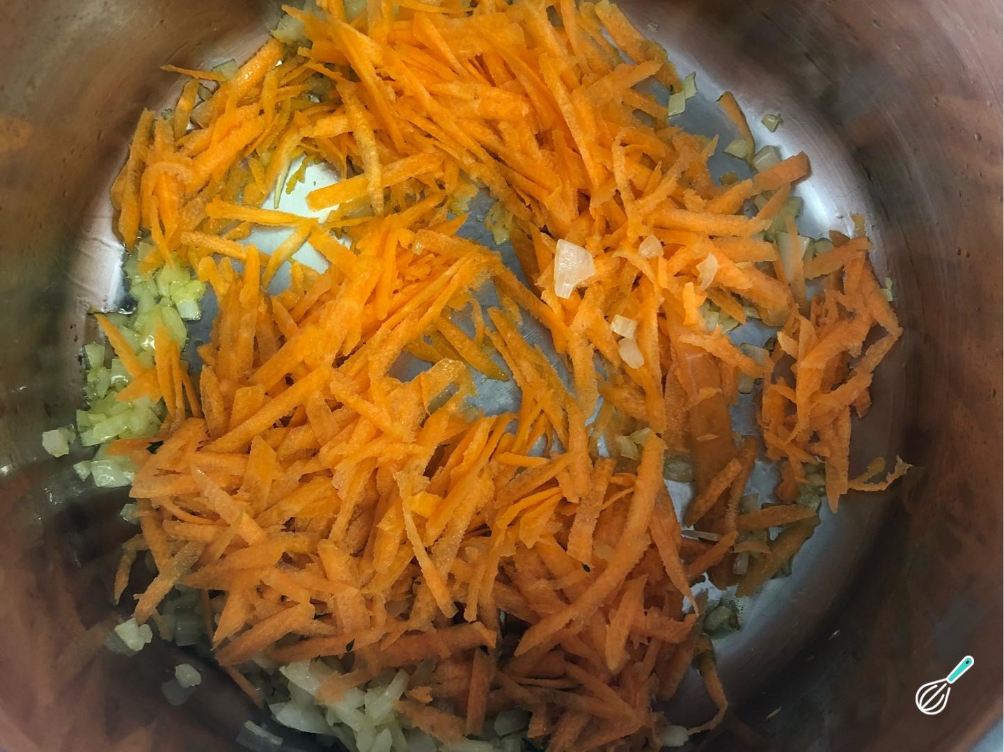 Junte a cenoura ralada e refogue mais um pouco, até murchar levemente.