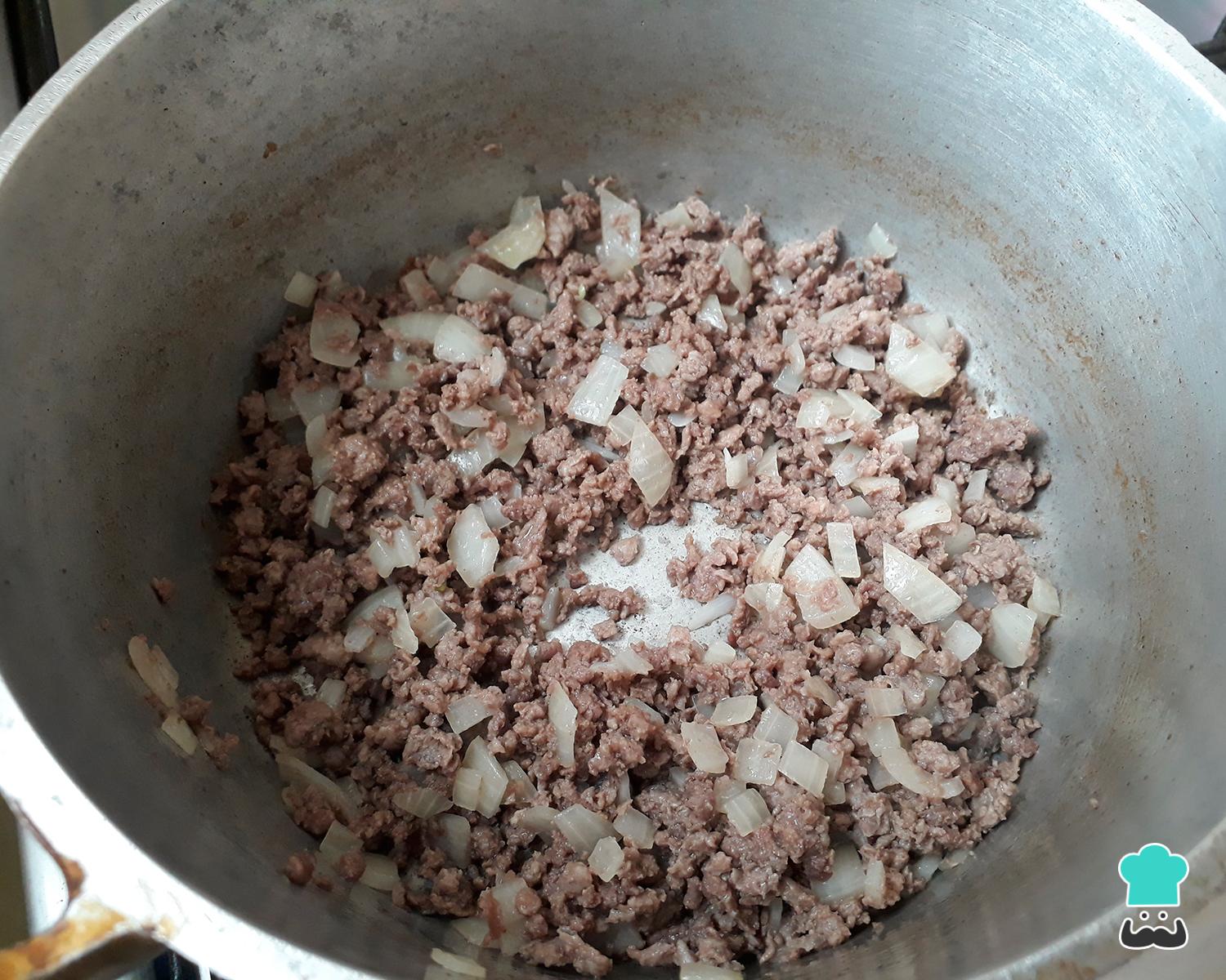 Para fazer o refogado de carne moída com vagem deixe a panela ficar bem quente e coloque um fio de azeite. Na sequência adicione somente a carne moída com a cebola e deixe refogar até o fundo da panela começar a ficar dourado.