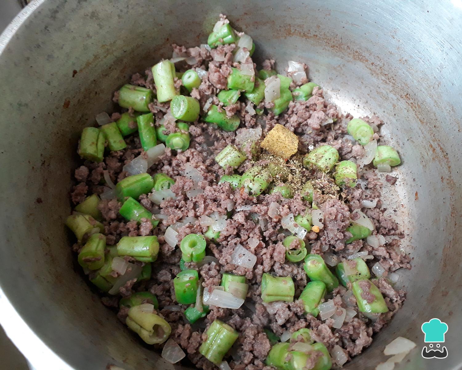 Depois coloque a vagem crua picada, ela irá cozinhar junto com a carne conferindo-lhe um sabor maravilhoso. Deixe refogar por mais alguns minutos e adicione os temperos: sal, pimenta do reino, o caldo de galinha e o chimichurri.