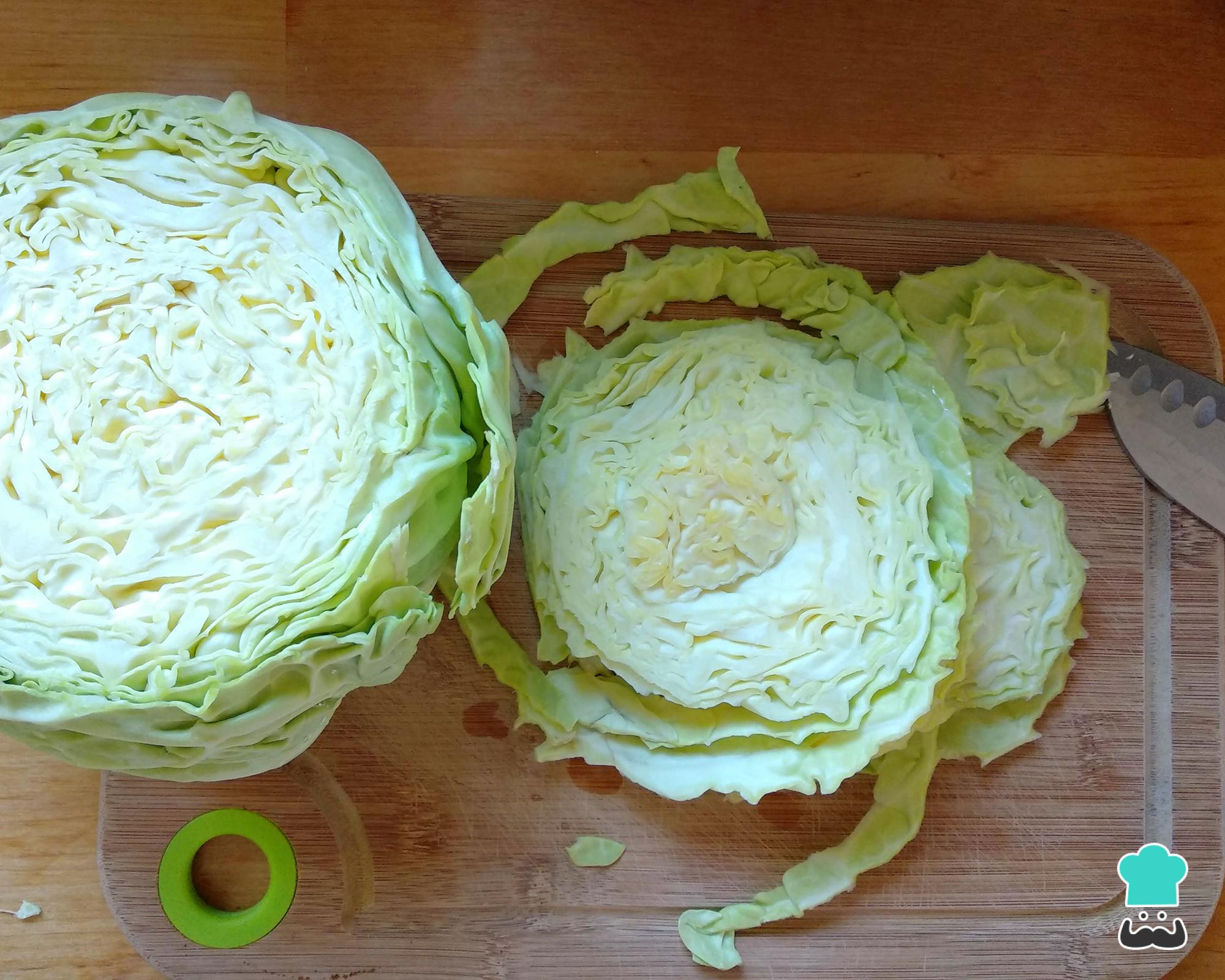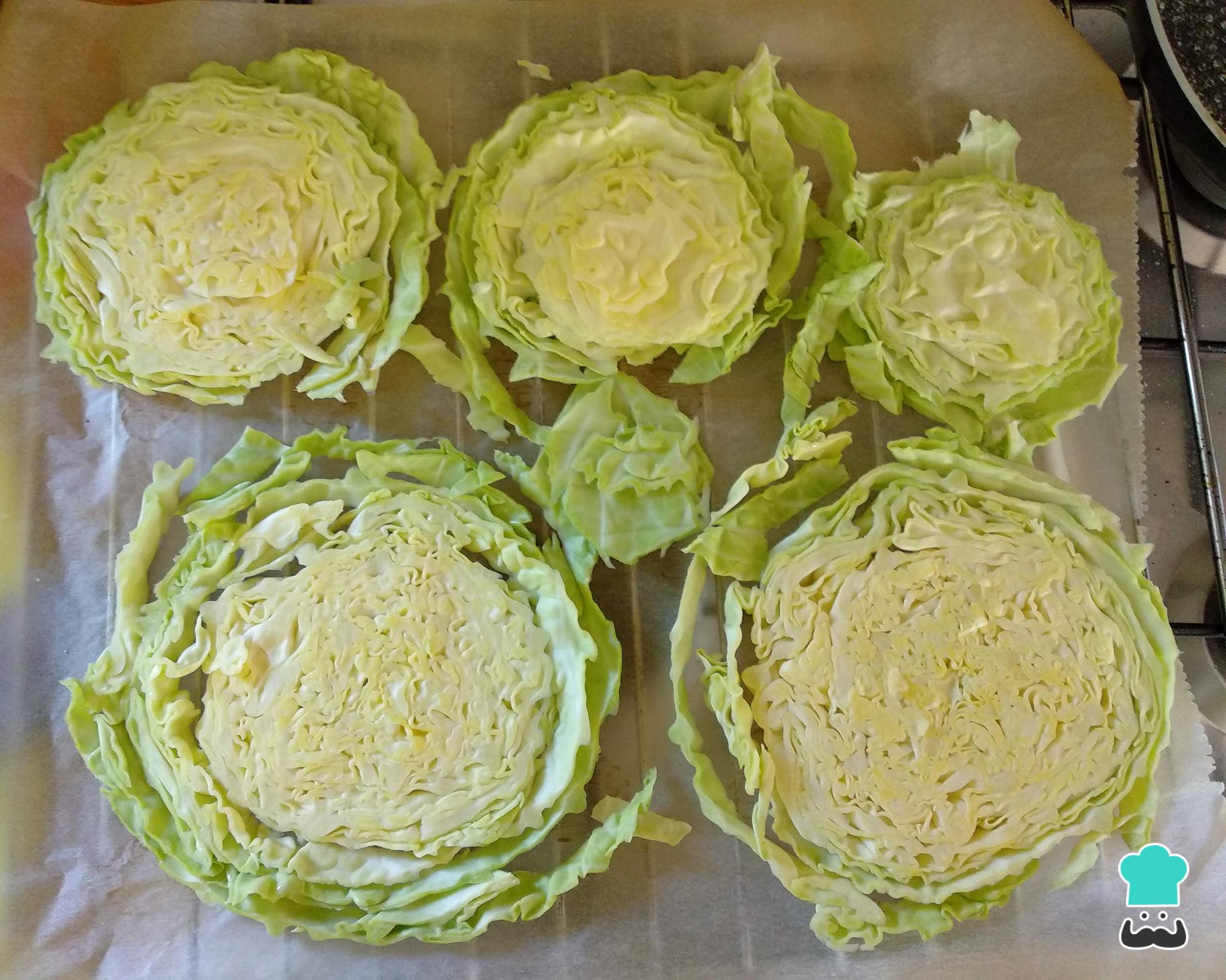 Pré-aqueça o forno a 180ºC. Retire as folhas velhas do repolho e corte o legume em fatias com mais ou menos 1 cm.