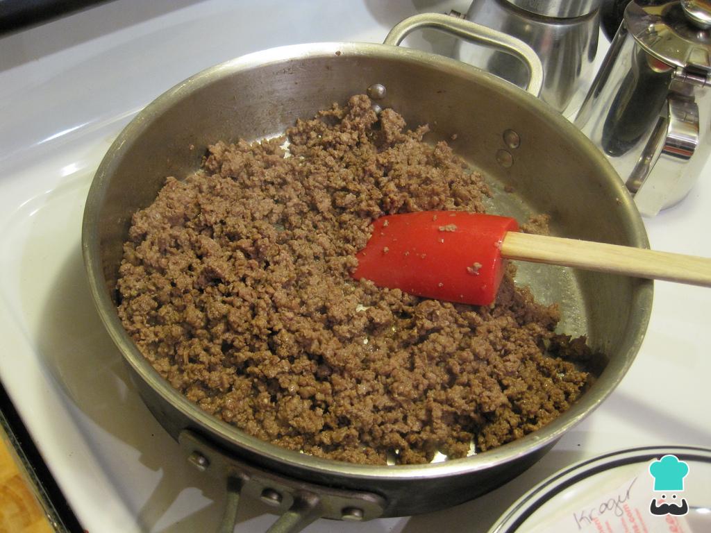 Em seguida, refogue meia cebola ralada e 2 dentes de alho picadinhos em uma panela com um pouco de óleo. Assim que dourar, junte a carne e deixe fritar, mexendo sempre. Junte meio copo de água e cozinhe mexendo para não queimar.