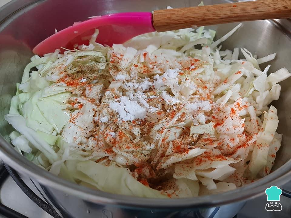 Acrescente o repolho e tempere com sal, pimenta do reino e páprica. Refogue por aproximadamente 10 minutos ou até o repolho murchar e ficar bem macio.