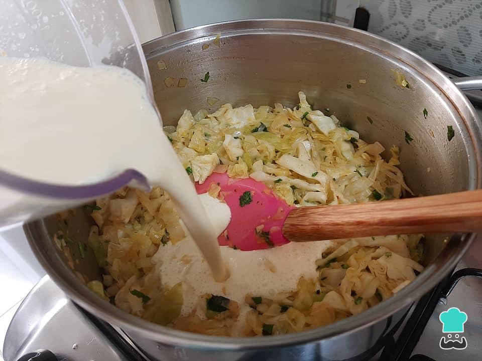 Acrescente cheiro verde ao refogado de repolho e despeje o creme de milho batido, misturando bem.