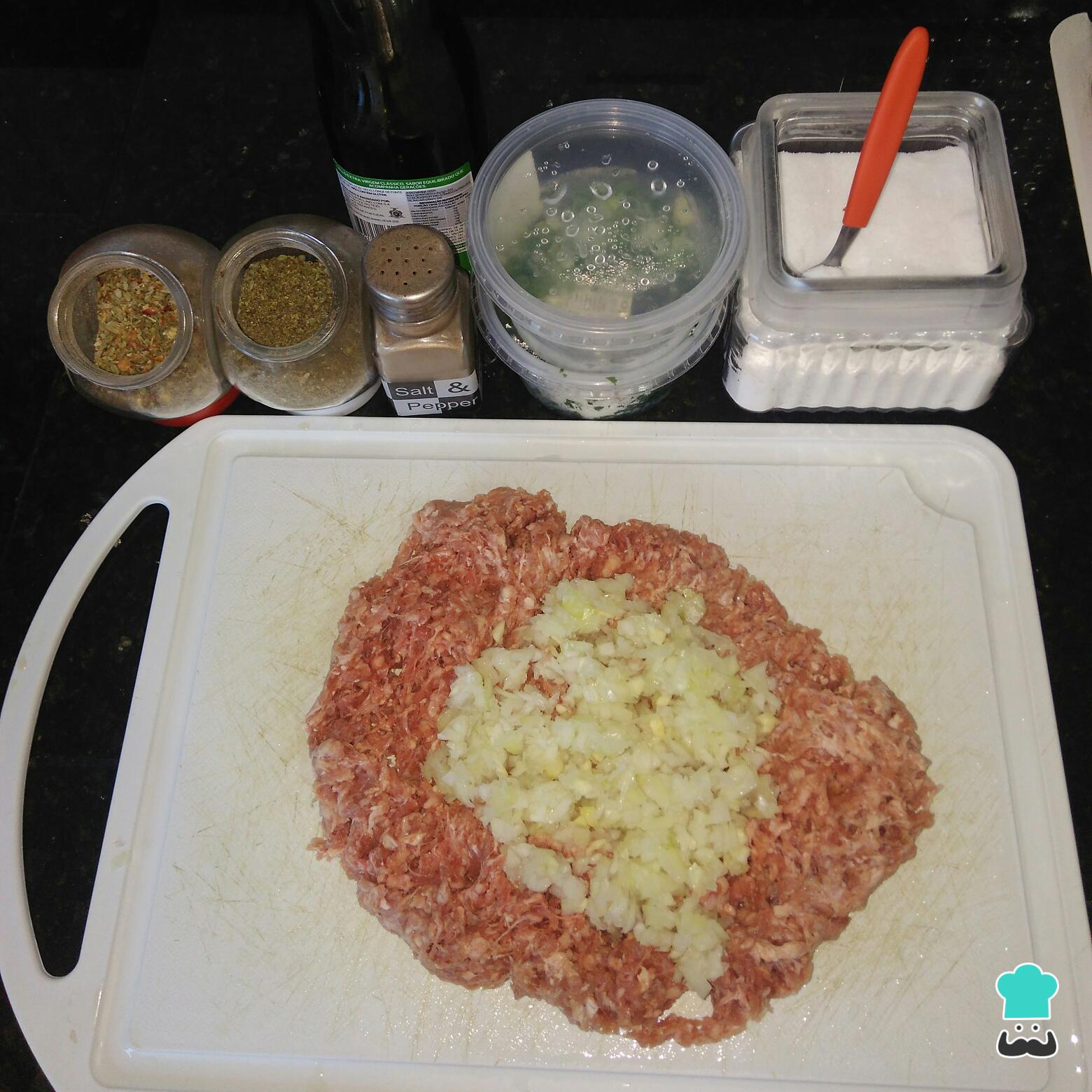 Tempere a carne moída com a metade da cebola picadinha e os outros ingredientes a gosto.
