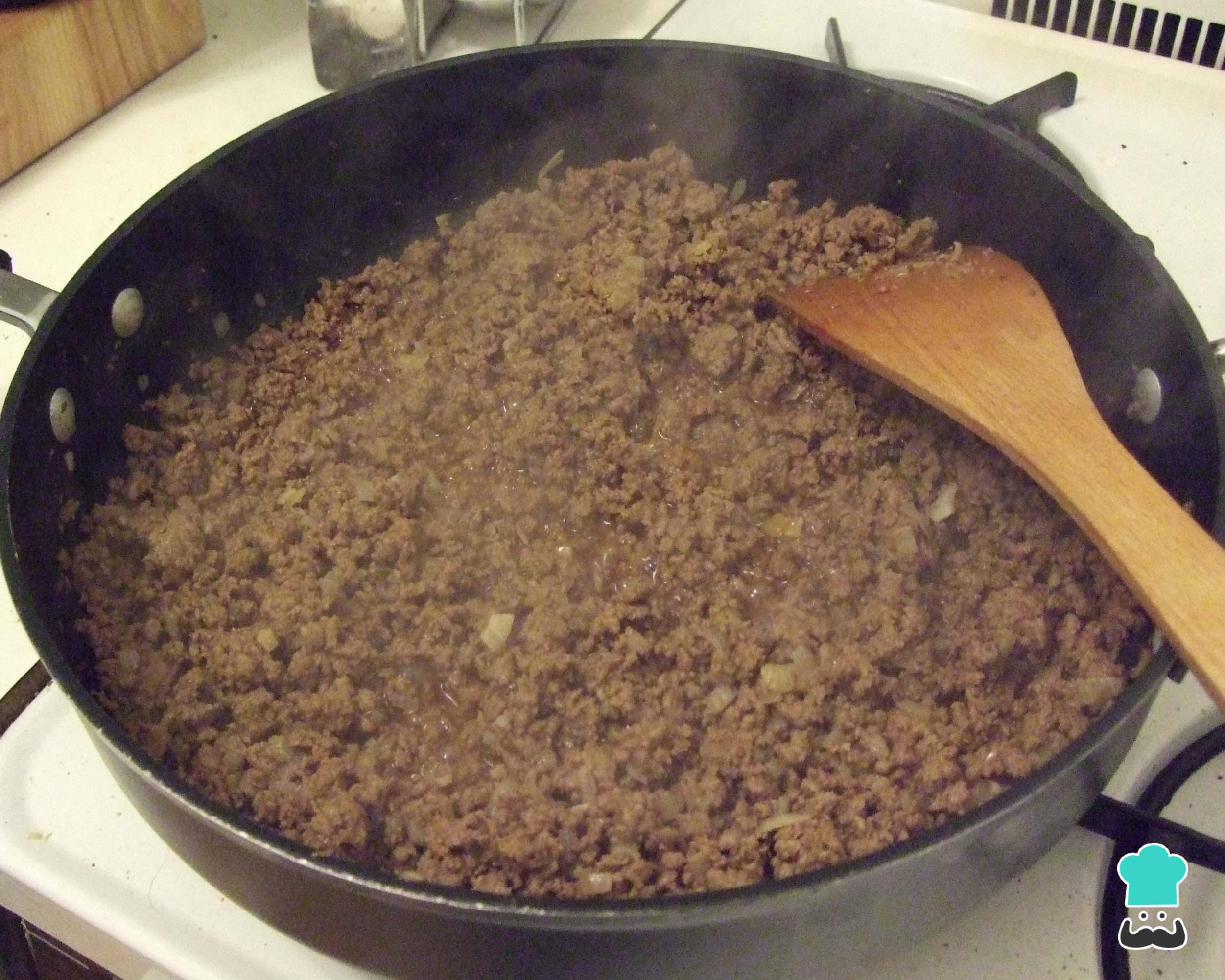 Em uma panela doure o restante da cebola picadinha no azeite a gosto. Adicione a carne moída e refogue junto até a carne ficar soltinha.