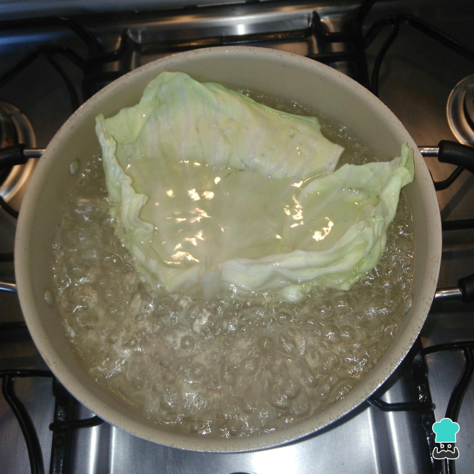 Ferva água em outra panela e cozinhe rapidamente as folhas de repolho - as folhas não podem ficar nem muito cruas e nem muito moles. Para parar o cozimento, retire as folhas para uma tigela com água gelada.
