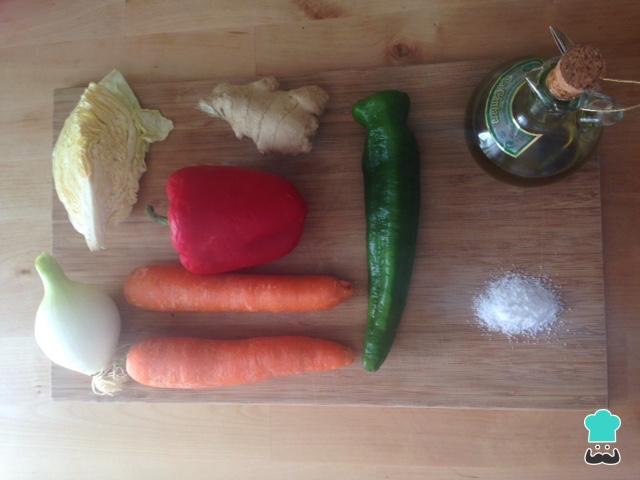 Comece por reunir todos os ingredientes necessários ao preparo desta receita de repolho refogado. Para que a receita fique mais saborosa e vitaminada incluímos também pimentões e gengibre.