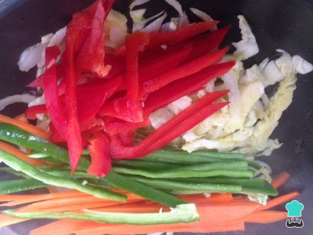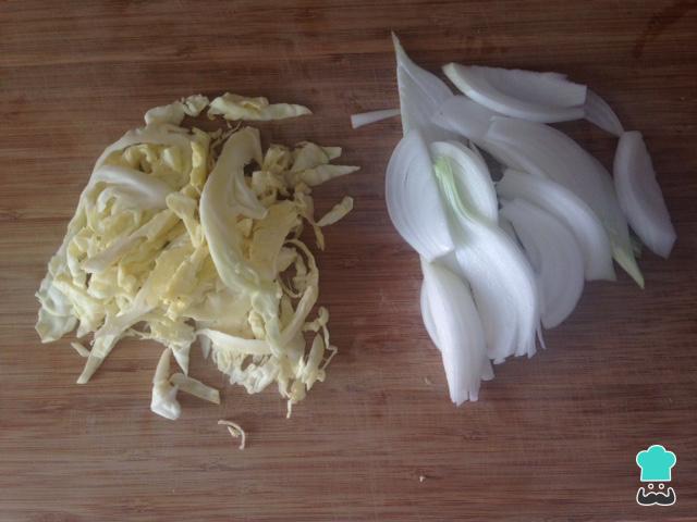 Em seguida corte o repolho e a cebola em tiras finas, como na imagem. Faça o mesmo com a cenoura e os pimentões.