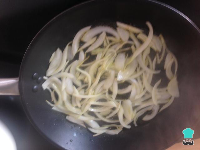 Numa frigideira com o azeite refogue a cebola até que comece a ficar transparente.