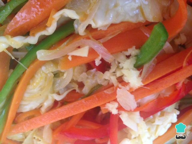 Para completar esta receita adicione o gengibre ralado, que irá conferir um gostinho oriental muito saboroso. Misture, refogue por um pouco mais e desligue o fogo.