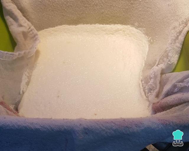Após você perceber que o leite está bem talhado e ainda morno, coloque em um pano de prato limpo, para retirar o soro. Reserve na geladeira por algumas horas, até escorrer todo o soro.