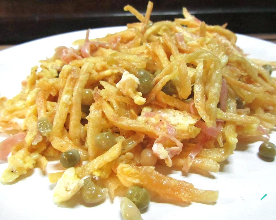 Enquanto estão fritando as batatas, corte o presunto em tiras finas, como na fotografia. Outra opção é simplesmente picar o presunto em pedacinhos.