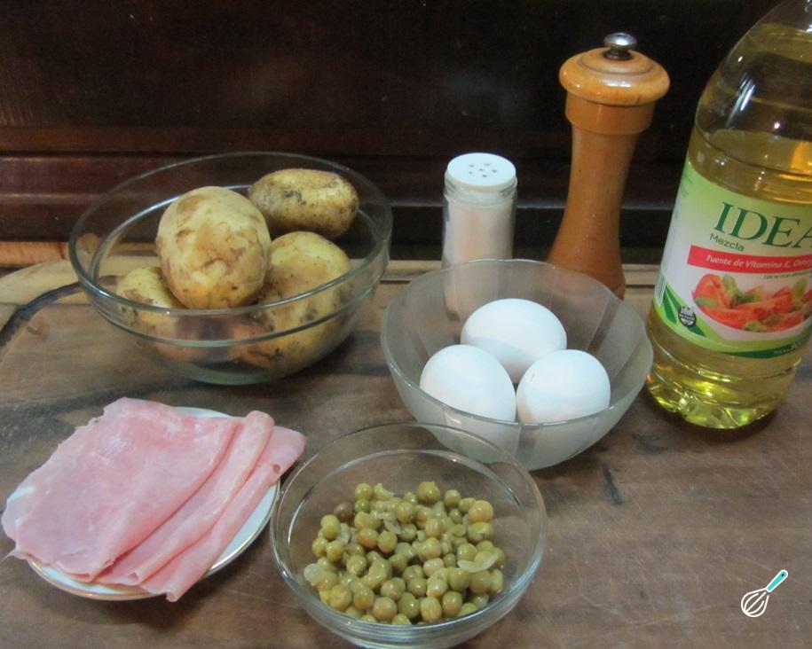 Reúna todos os ingredientes desta receita de revuelto gramajo. Além dos ovos e das batatas usei presunto e ervilha, mas existem muitos outros ingredientes que também vão bem. Exemplos: milho, tomate, pimentão, azeitona, etc.