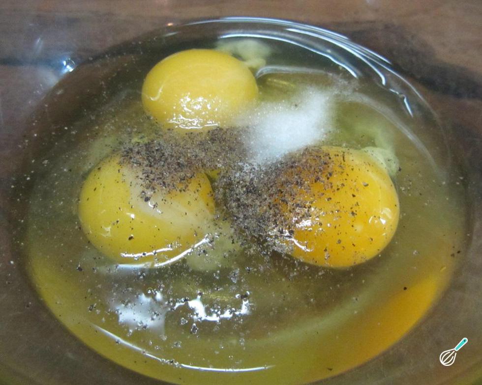Coloque os ovos numa tigela e tempere com sal e pimenta a gosto. Esta é uma receita de ovos mexidos, por isso bata os ovos com um garfo até espumar.