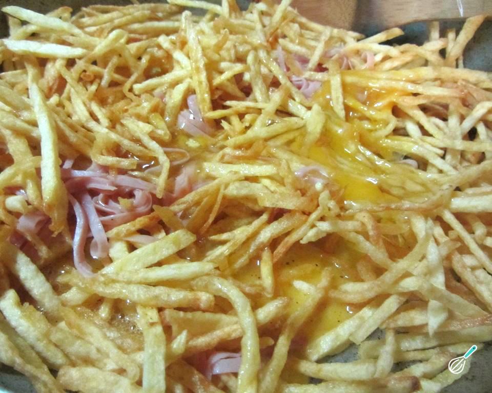 Assim que fritar todas batatas, coloque-as numa frigideira grande no fogo médio com um fio de óleo, para começar misturando com os restantes ingredientes. Coloque o presunto, misture, coloque os ovos e volte a misturar.