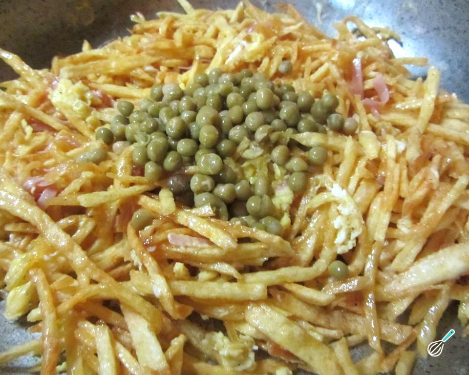 Fique mexendo os ingredientes para cozinhar o ovo sem que fique grudado na frigideira. Por fim coloque as ervilhas e volte a misturar. Desligue o fogo e tempere com sal e pimenta a gosto.