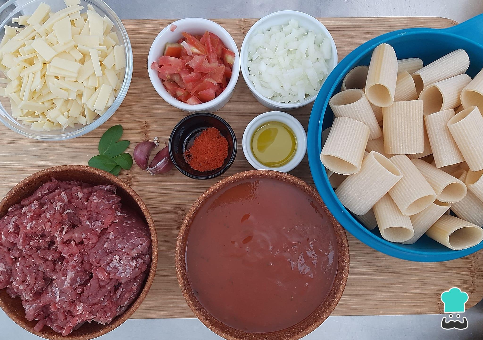 Separe os ingredientes necessários para esta receita de macarrão rigatoni recheado.