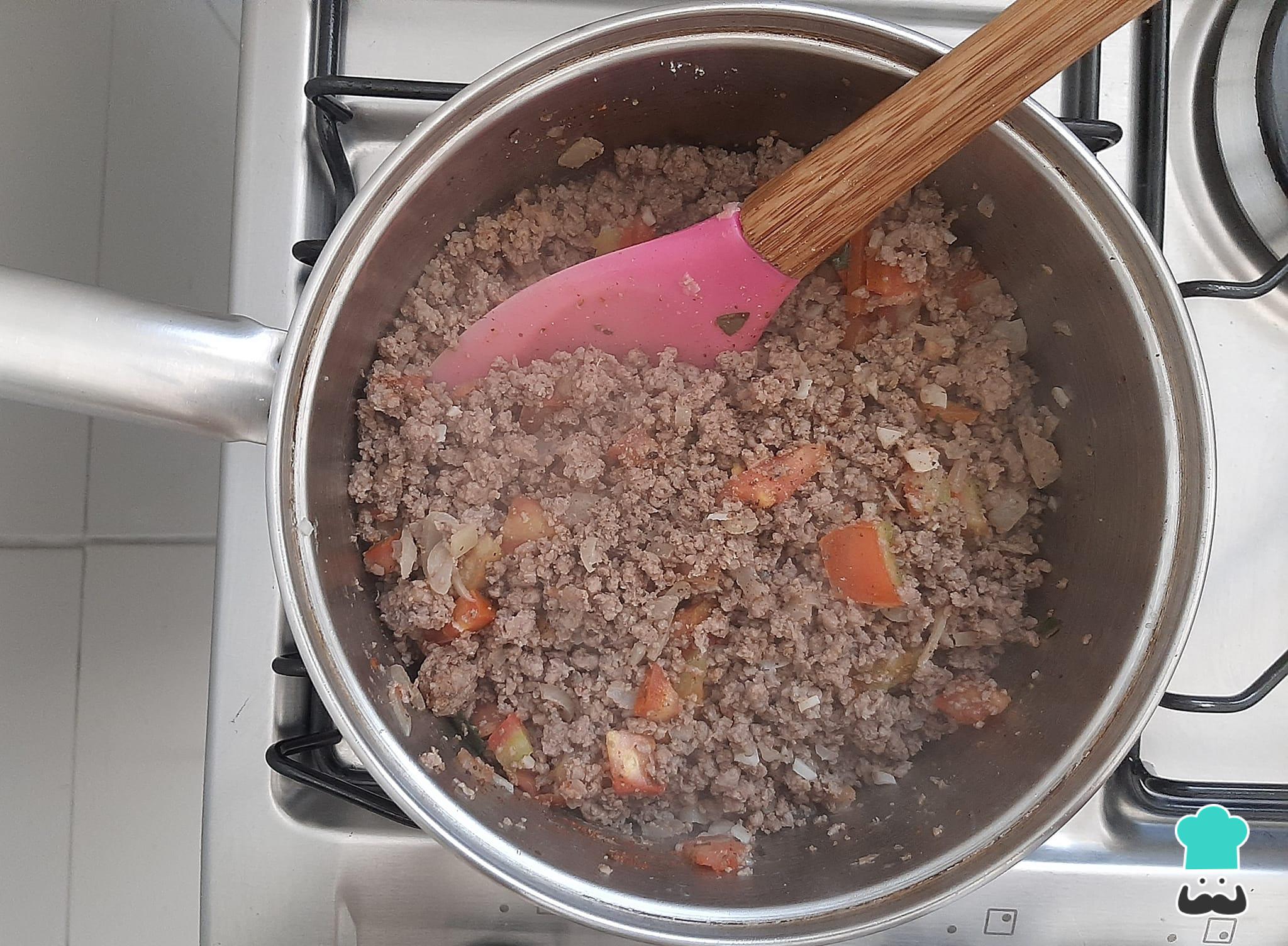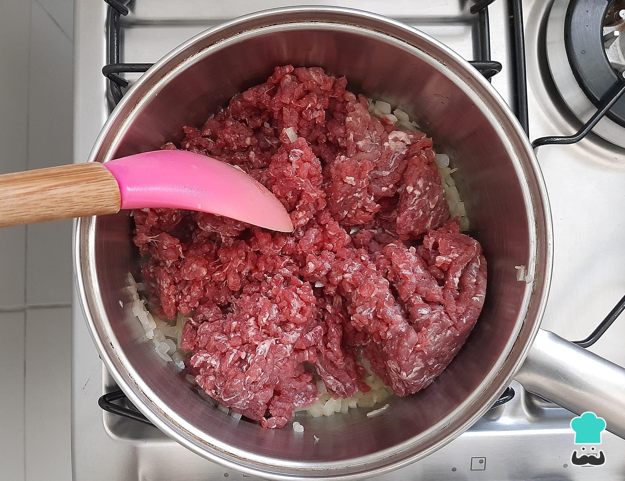Prepare o molho à bolonhesa levando ao fogo a cebola e o alho picados para refogar com azeite de oliva. Adicione a carne moída em seguida e deixe refogando até que o caldo da carne seque.