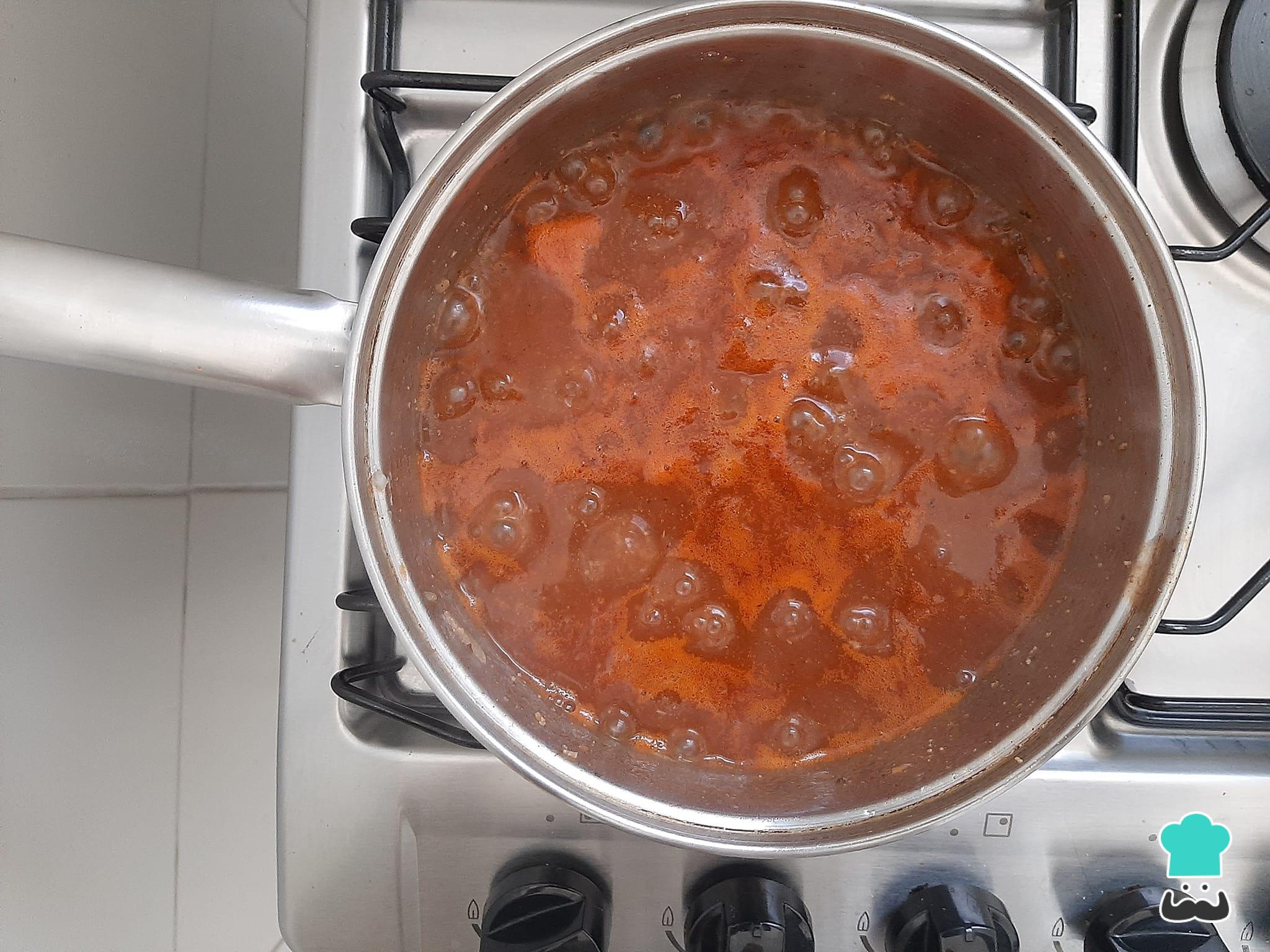 Adicione o molho de tomate e tempere com sal, pimenta do reino, páprica, manjericão seco e fresco, deixando cozinhar em fogo baixo por 15 minutos.