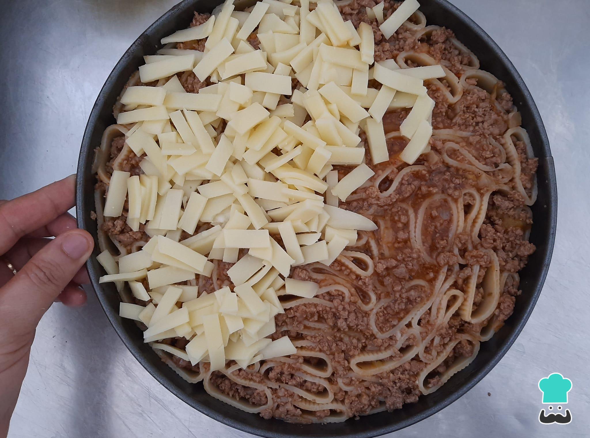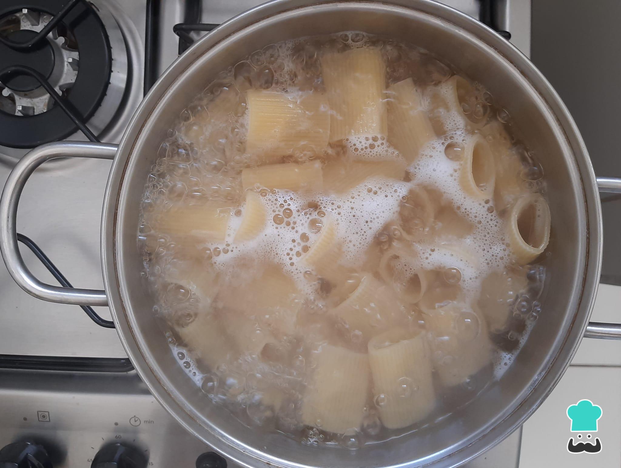 Enquanto isso, cozinhe a massa rigatoni com água e sal pelo tempo sugerido na embalagem. Depois escorra a massa e deixe amornar para começar a montar a torta.