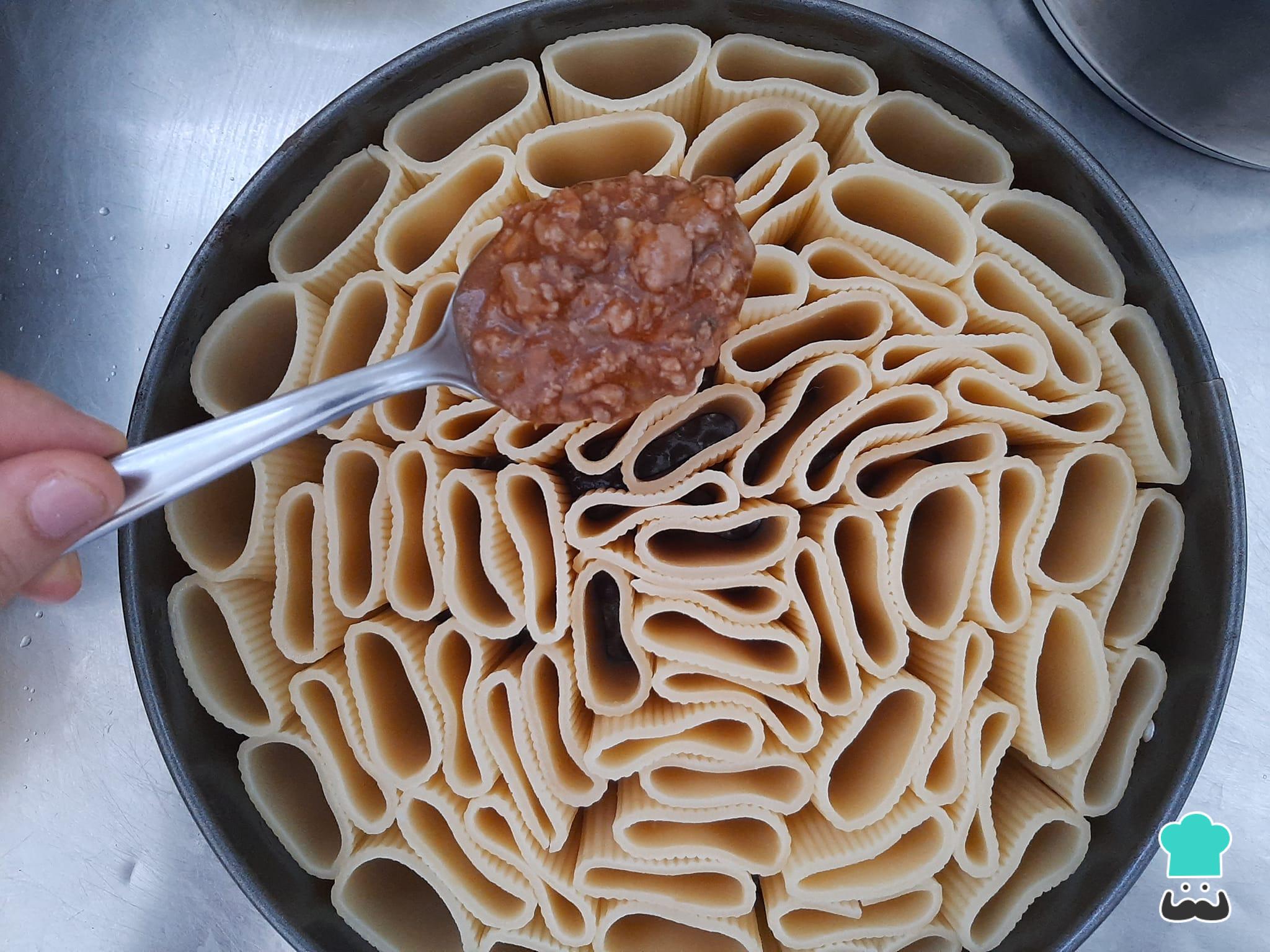 Acomode na forma o rigatoni cozido, lado a lado, em pé, de modo que você possa preencher todos eles com o molho a bolonhesa pronto.