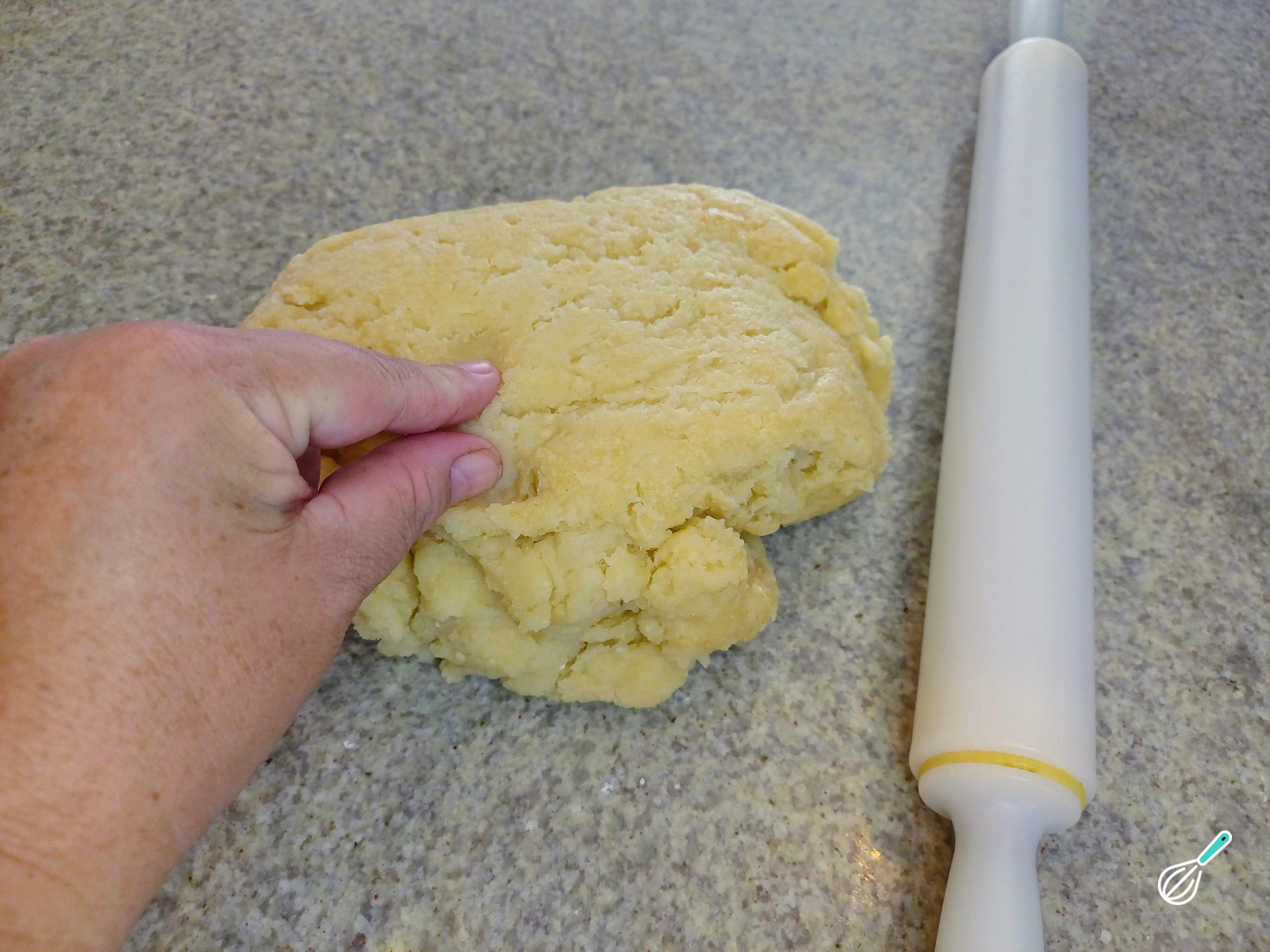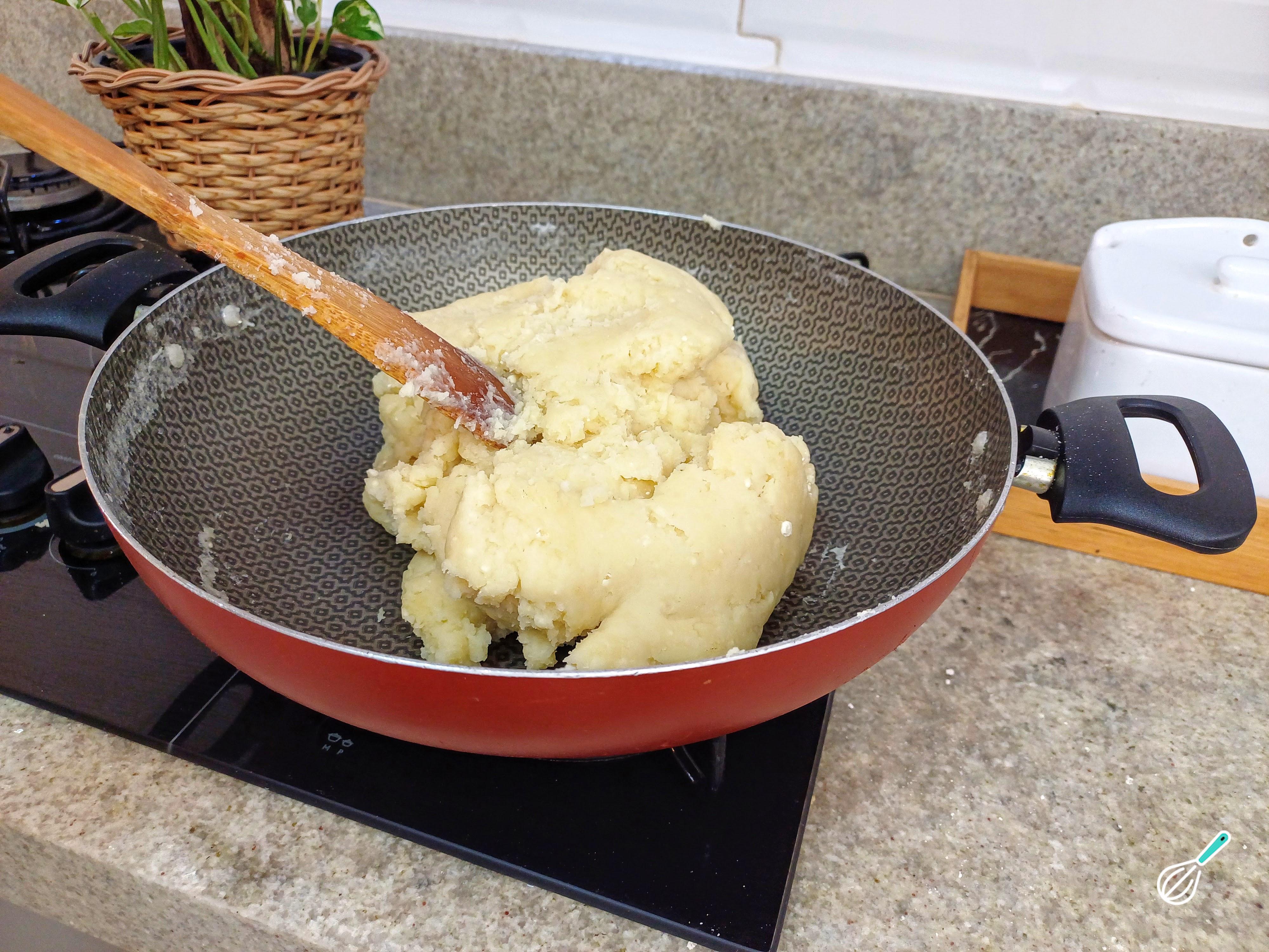 Dica: Utilize uma espátula ou rolo de macarrão para ajudar a sovar, pois a massa deve ser sovada ainda quente.
