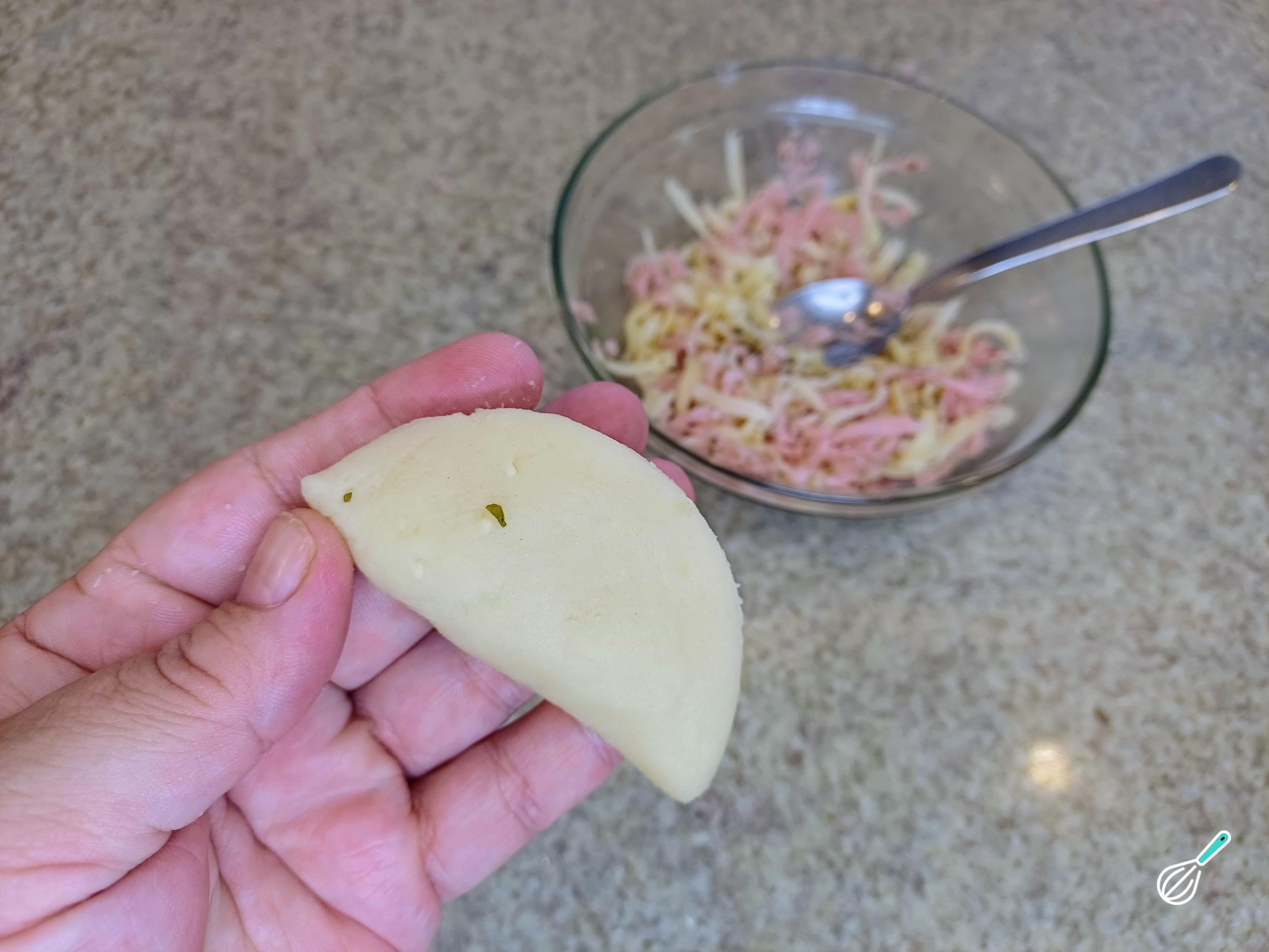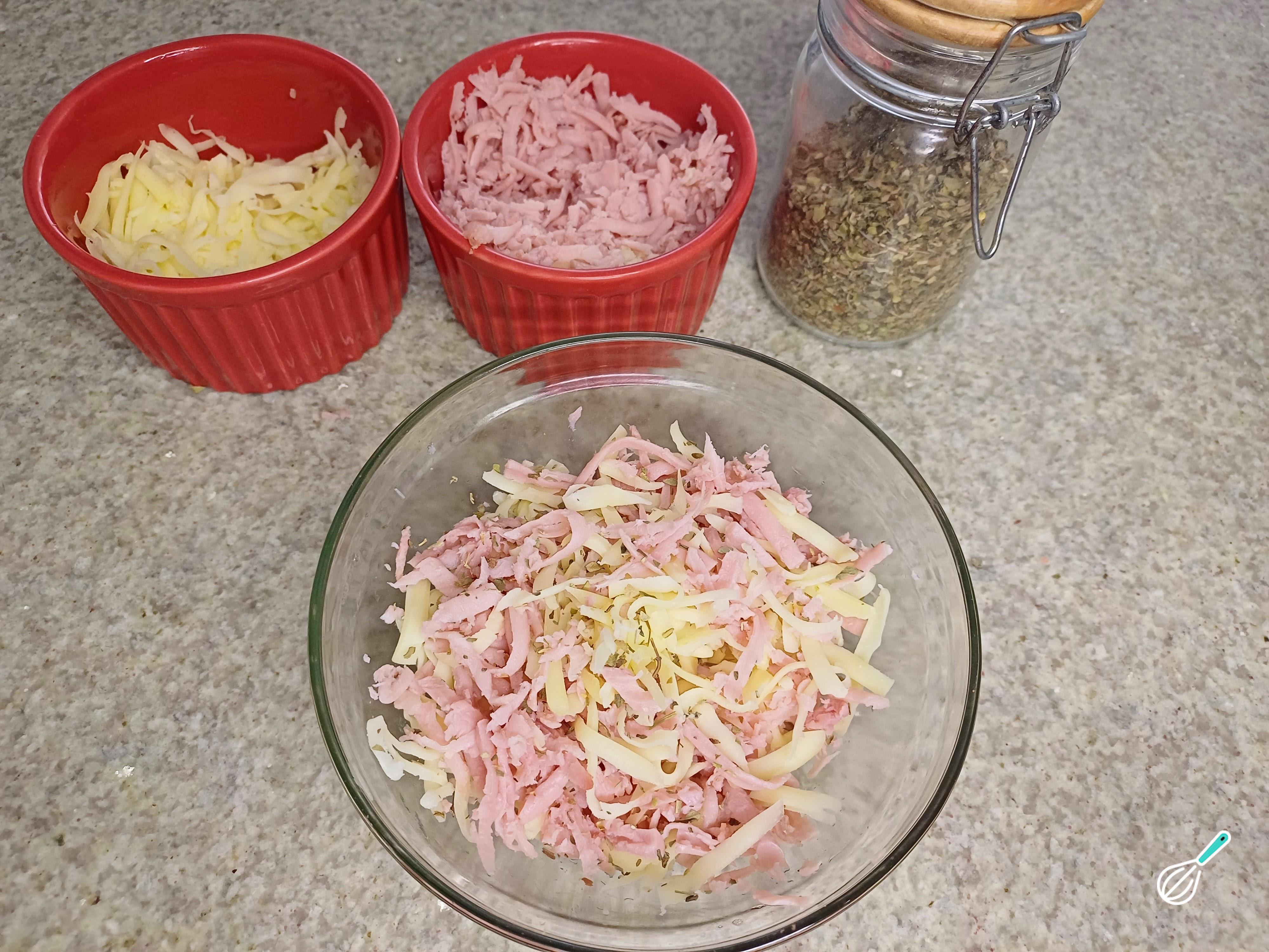 Para o recheio, rale o presunto e a muçarela em ralador grosso, misture tudo em uma tigela e acrescente orégano á gosto.