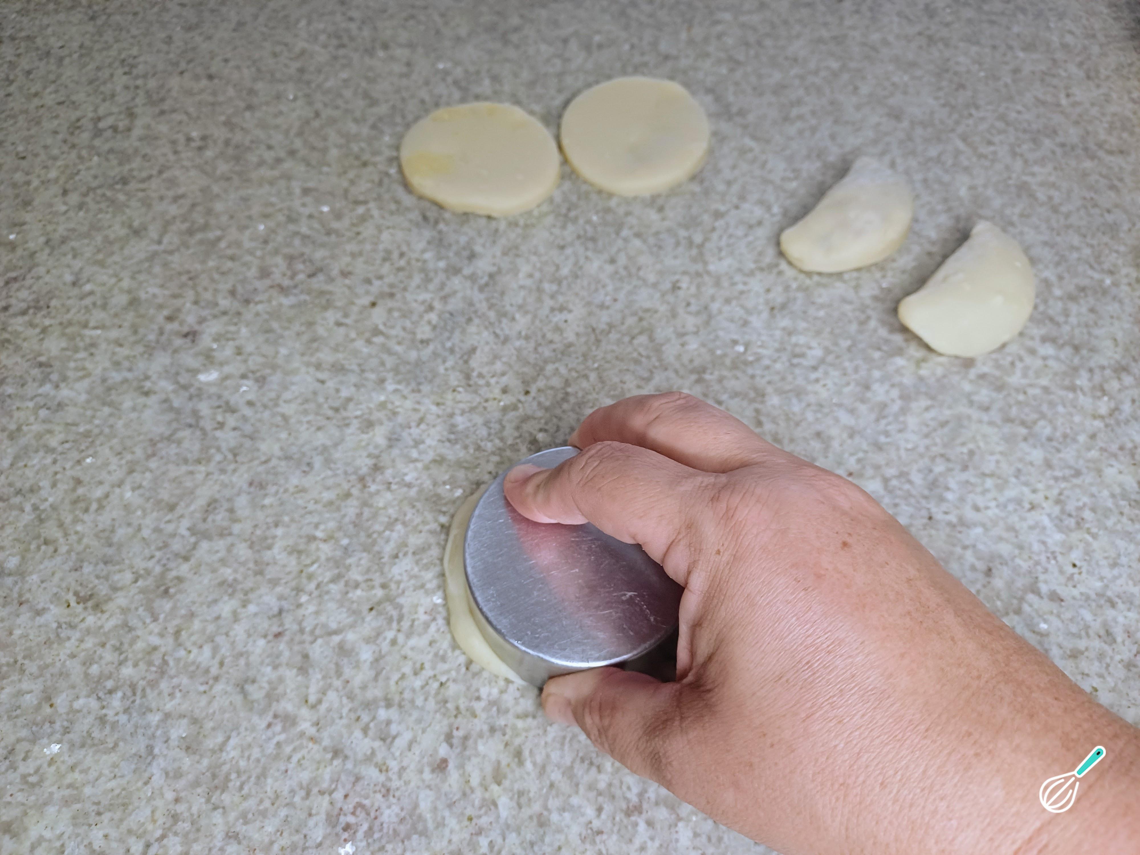 Abra a massa com um rolo, em uma espessura não muito fina, corte os círculos com auxilio de um cortador ou copo.