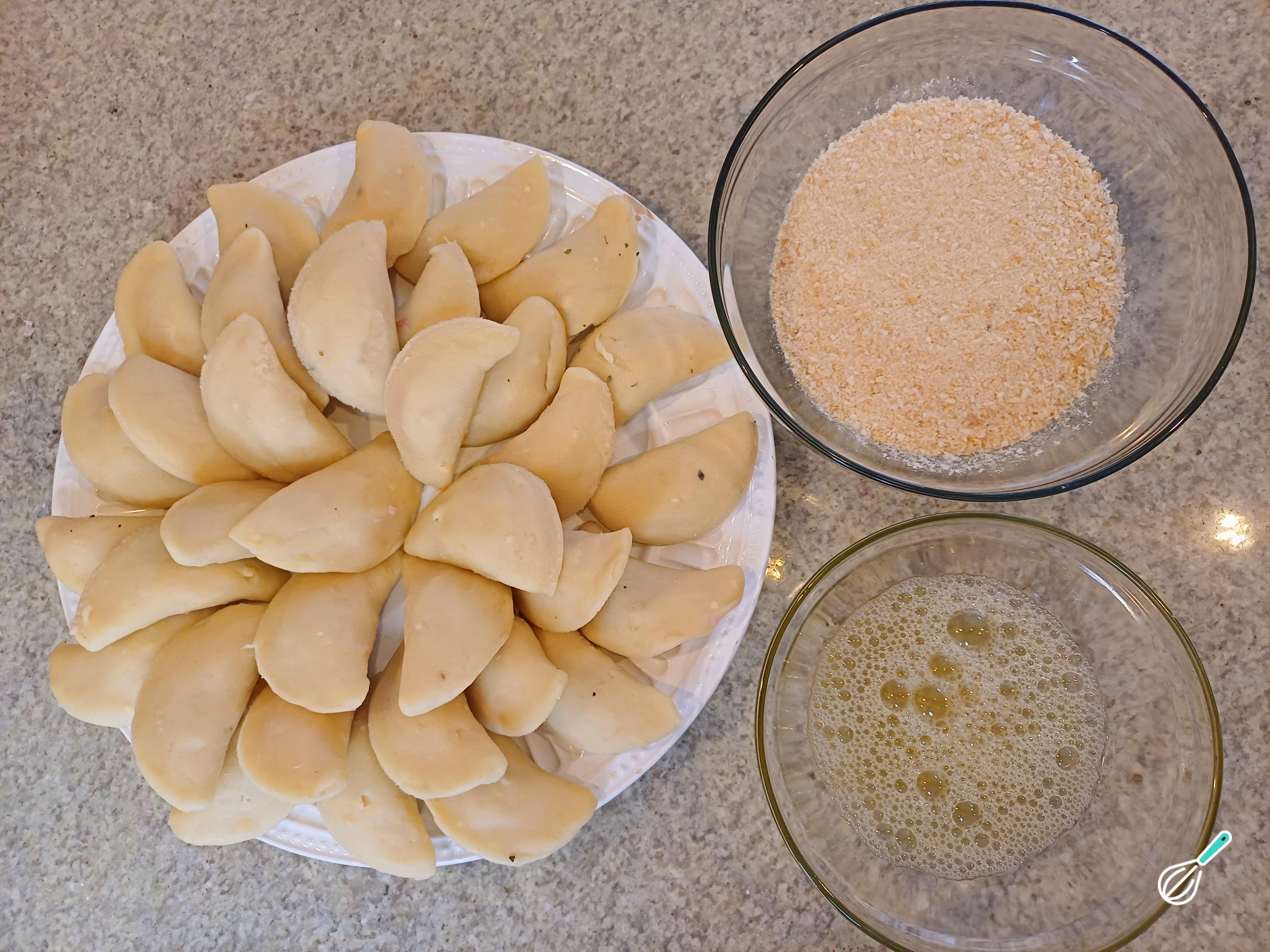 Para empanar os seus risoles de pizza, bata as claras com a água, tempere com uma pitada de sal e coloque a farinha de rosca em uma tigela funda.