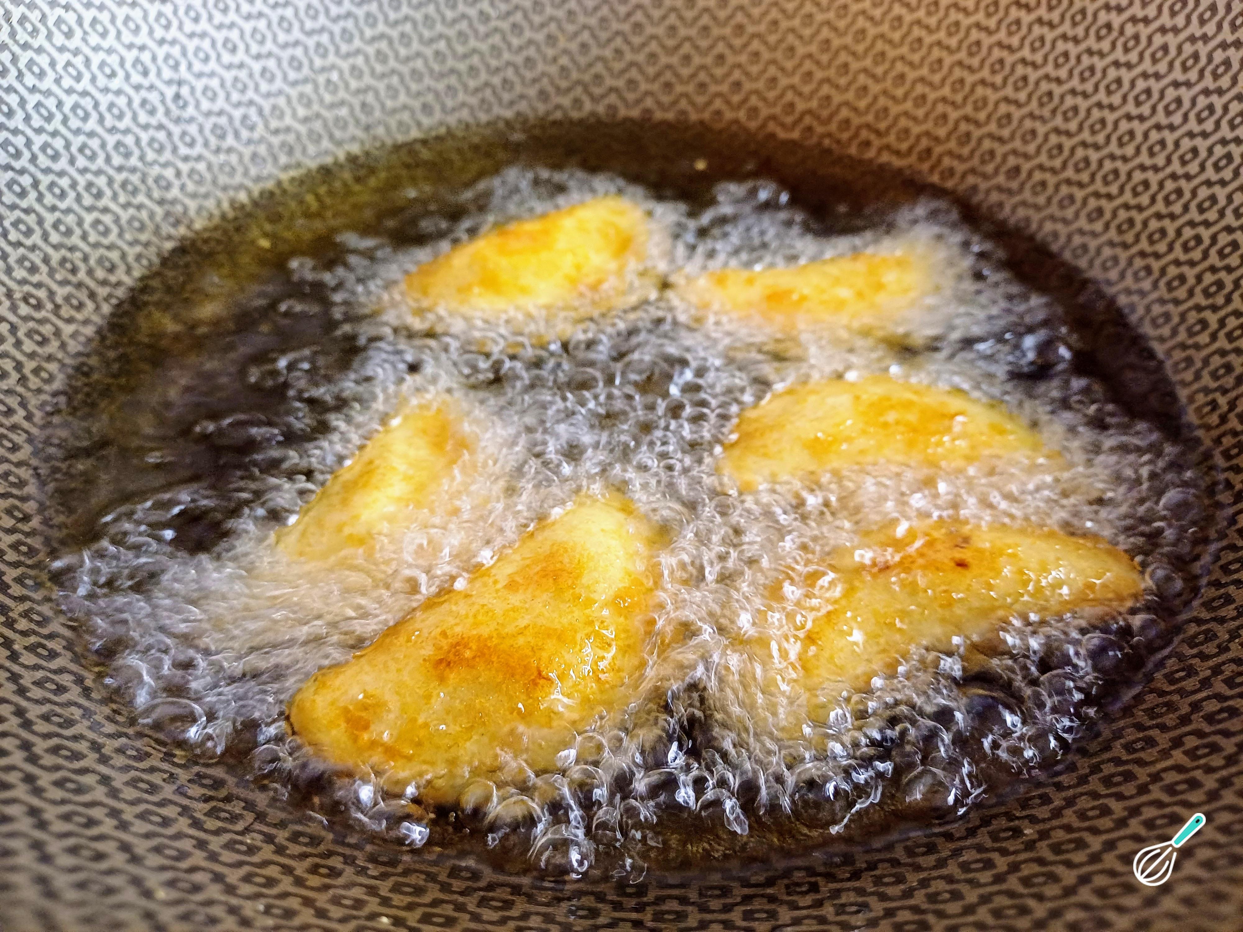 Aqueça bem o óleo em uma panela funda e frite os risloes dos dois lados até ficarem levemente dourados. Retire com uma escumadeira e deixe secar em papel absorvente ou peneira.