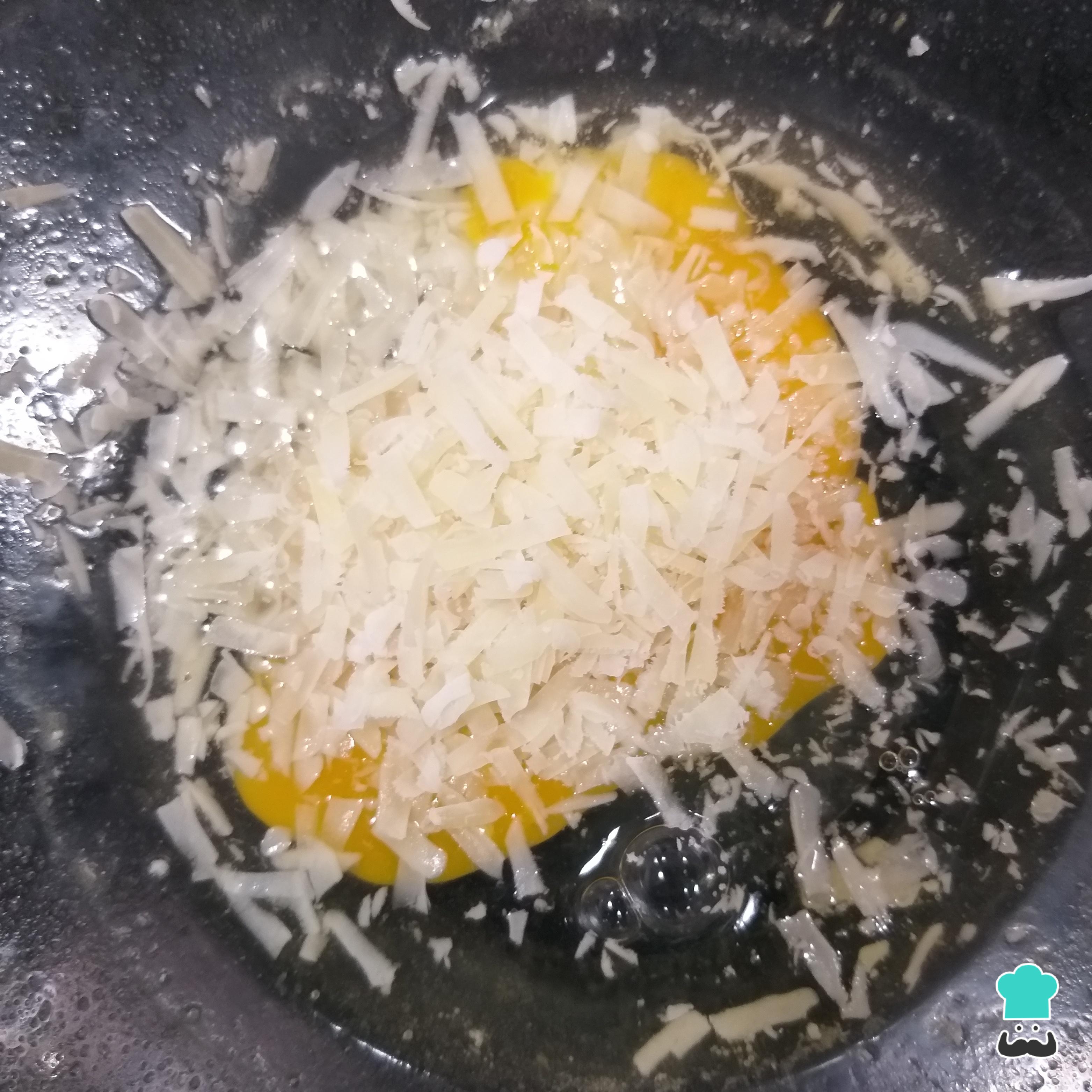 Em um pote misture bem com um garfo o ovo (clara e gema) e o parmesão. Reserve.