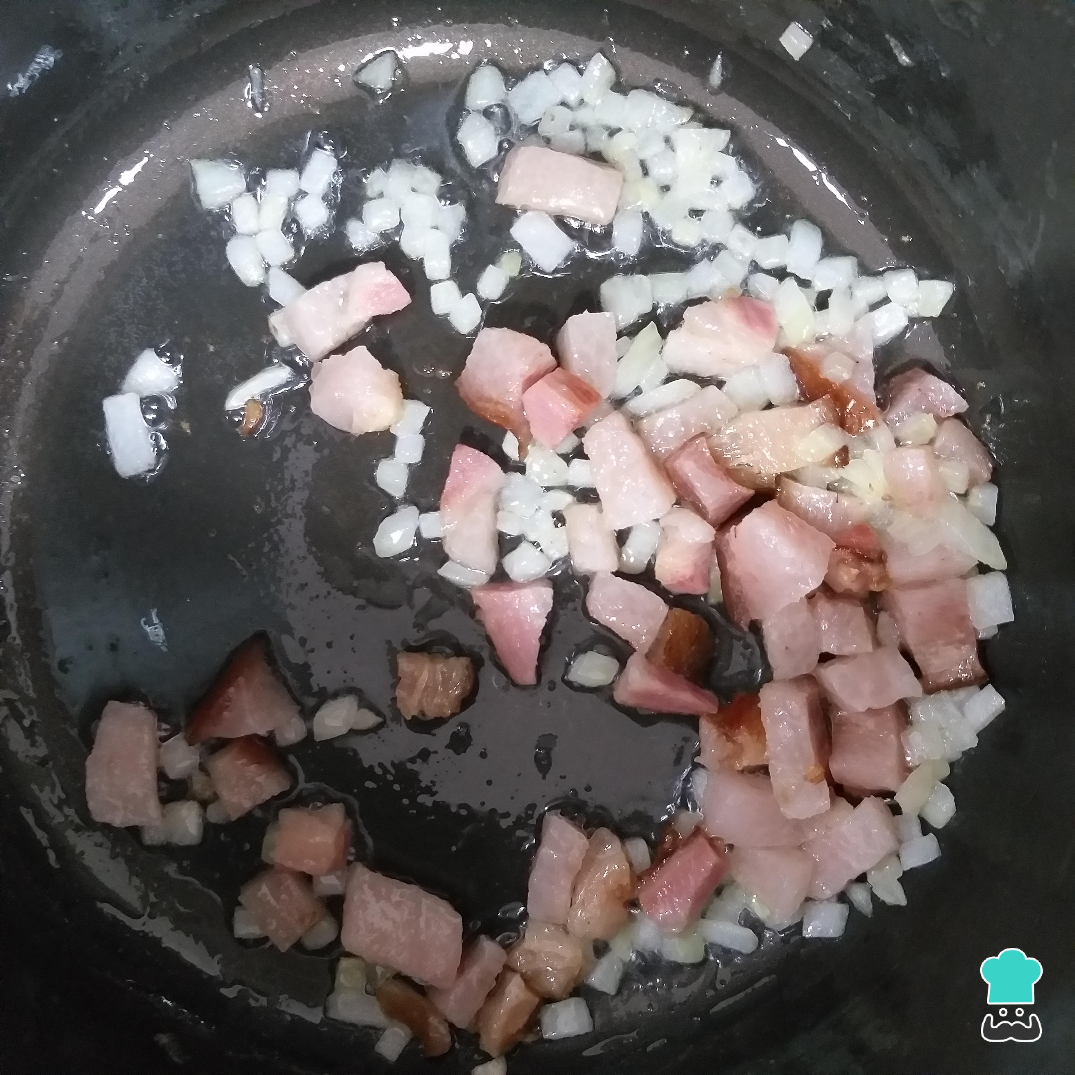 Coloque na panela de pressão o bacon, a cebola e o óleo. Leve ao fogo médio, misture bem e deixe dourar.