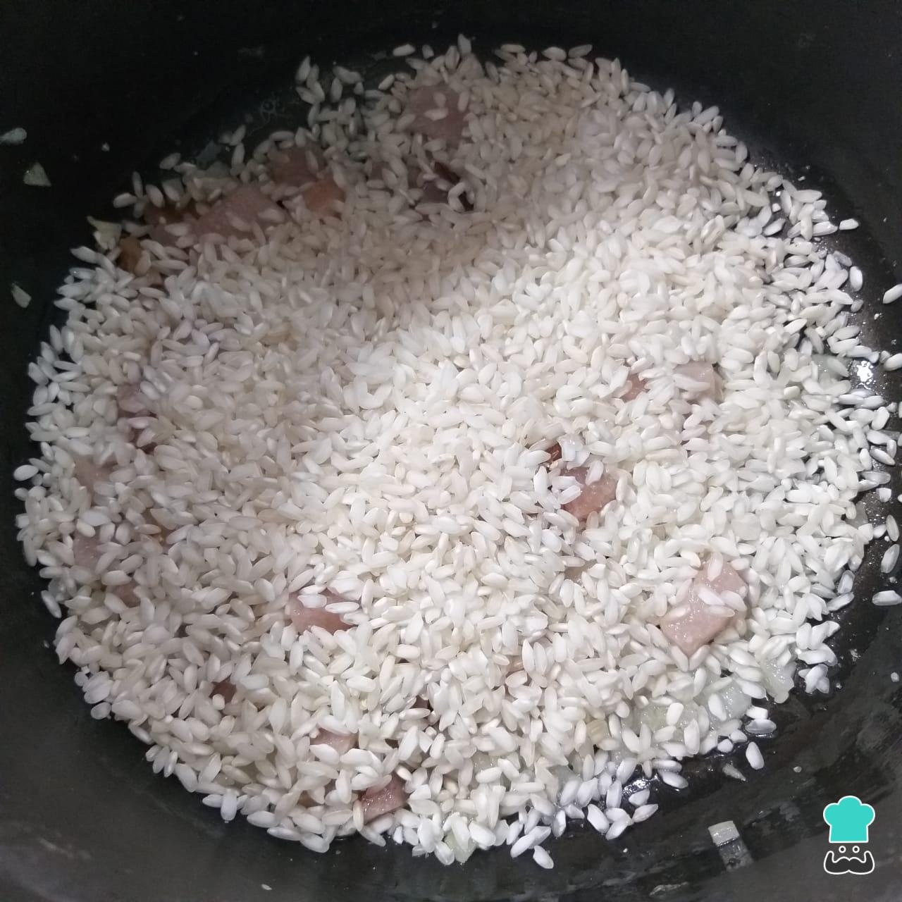 Acrescente o arroz, o sal, as folhas de louro e o limão. Misture e refogue por 1 minuto, para que esses ingredientes soltem o sabor no arroz e os grãos de arroz comecem a abrir.