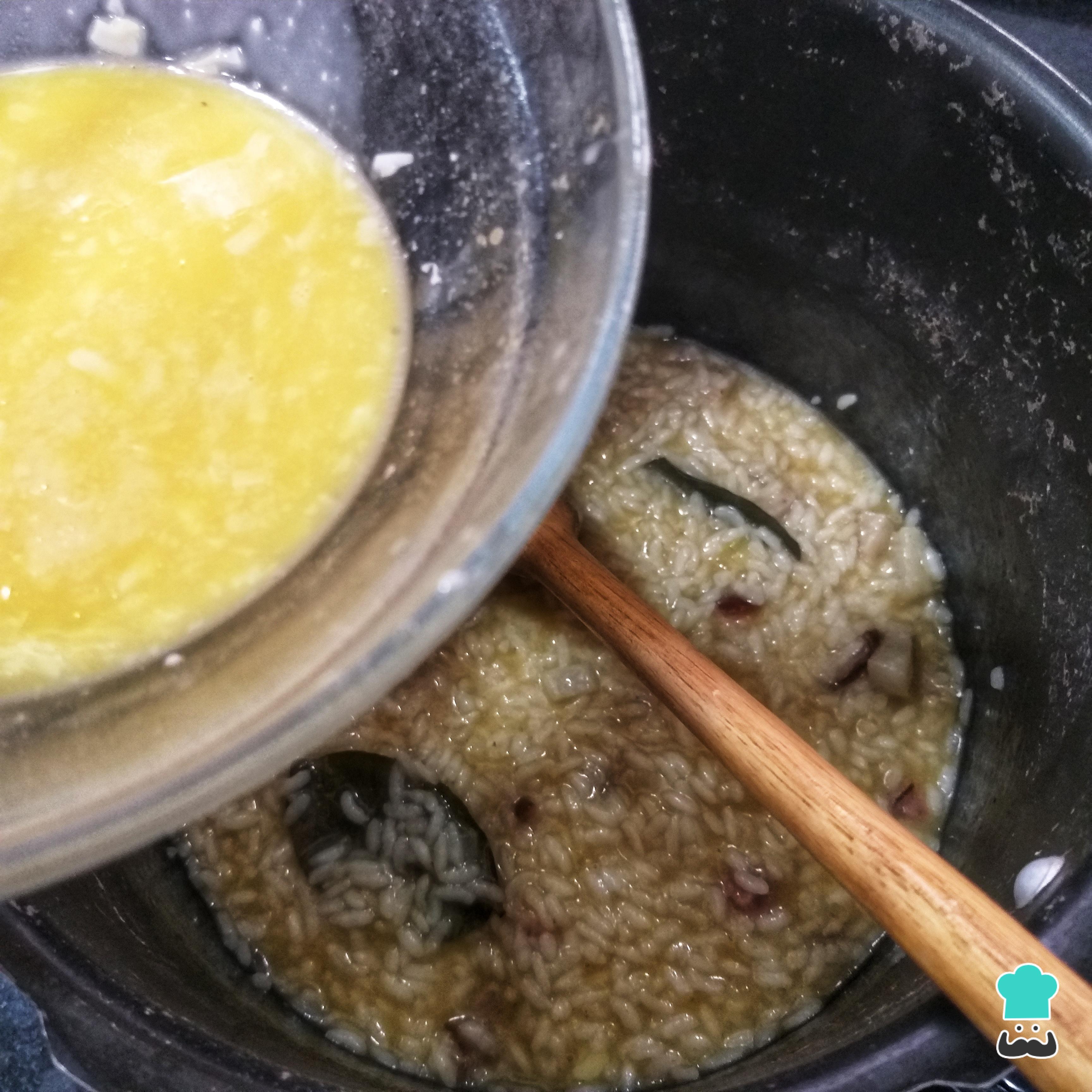 No final desse tempo coloque a manteiga e mexa bem. Acrescente a mistura de ovo e parmesão, bem devagar enquanto mexe o risoto, para que o ovo não coagule.