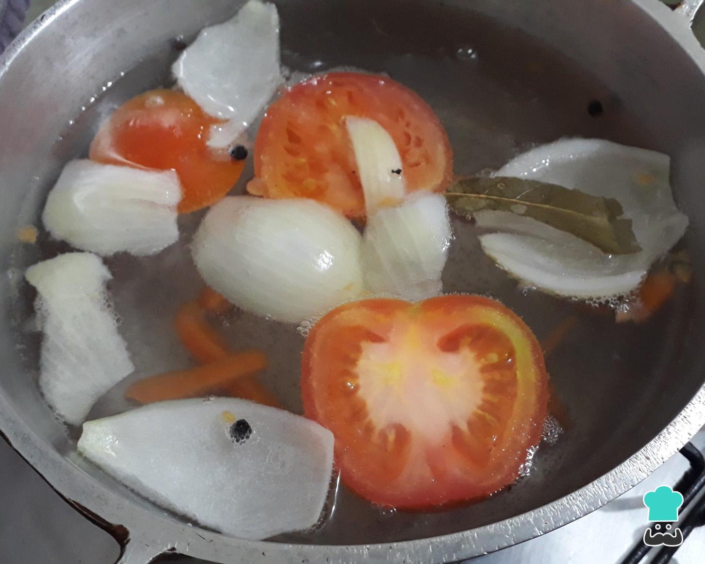 Para conseguir um risoto caprese bem saboroso recomendo usar um caldo de legumes caseiro. Basta juntar os legumes de sua preferência e temperos com um litro de água e ferver. Neste caso usei tomate, cebola, cenoura, louro e pimenta do reino em grão.