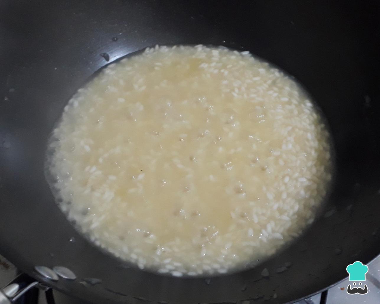 Acrescente o arroz e refogue por 3 minutos ou até os grãos de arroz ficarem ligeiramente transparentes. Coloque o vinho branco e mexa bem até o vinho evaporar, para libertar o álcool.