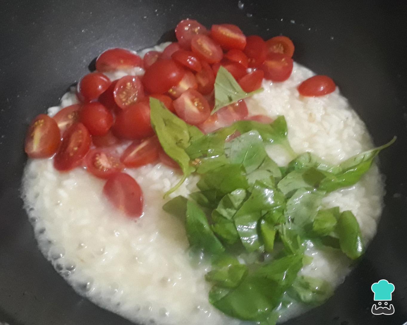 Quando o arroz estiver quase no ponto, acrescente os restantes ingredientes principais desta receita: os tomates cerejas cortados ao meio e o manjericão fresco picado grosseiramente.