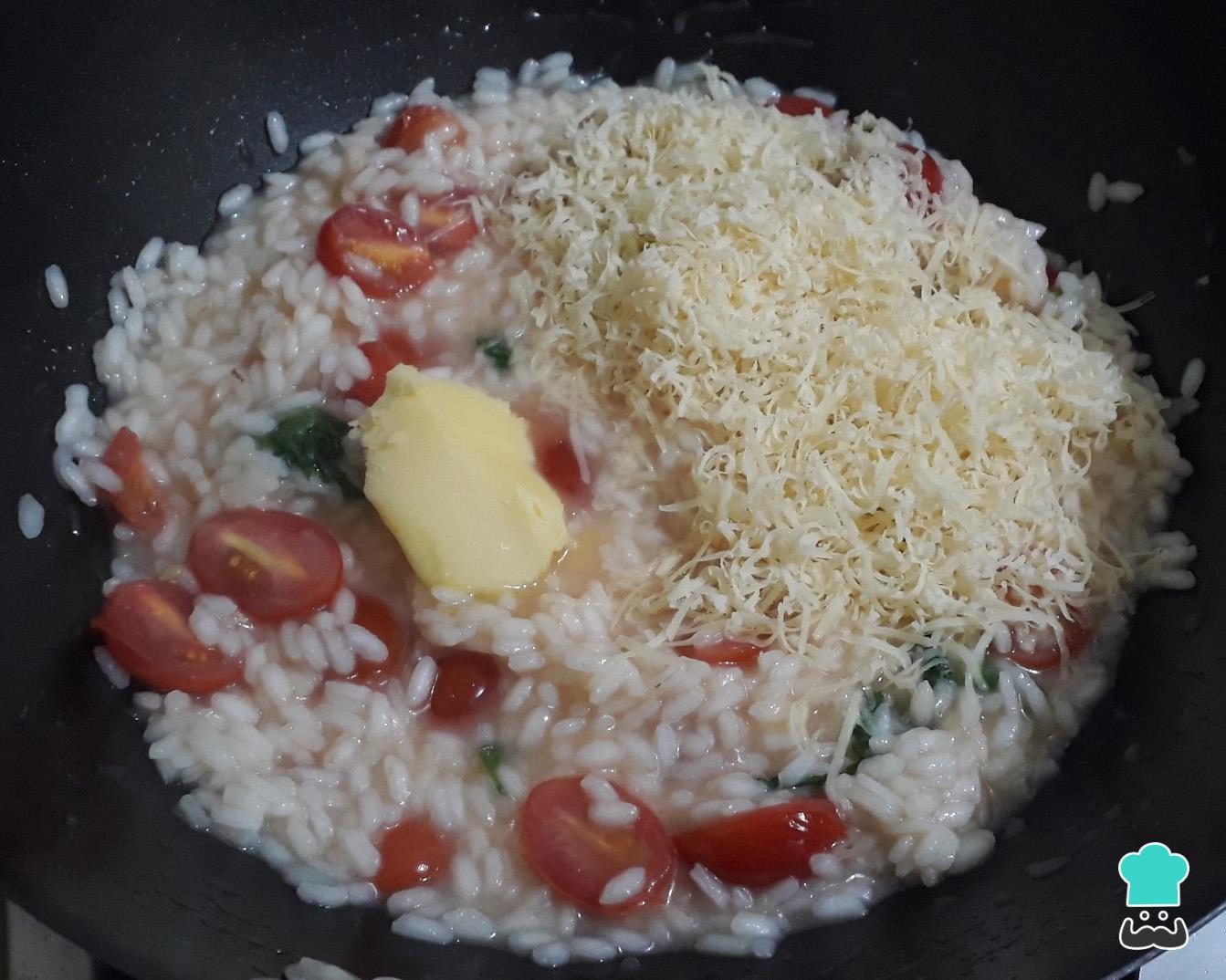 Mexa por mais uns 3 minutos, para os sabores se agregarem ao risoto e até os grãos de arroz ficarem prontos. Desligue o fogo e finalize com o parmesão e uma colher de manteiga. Acerte o sal após acrescentar o queijo, pois ele já possui sal.