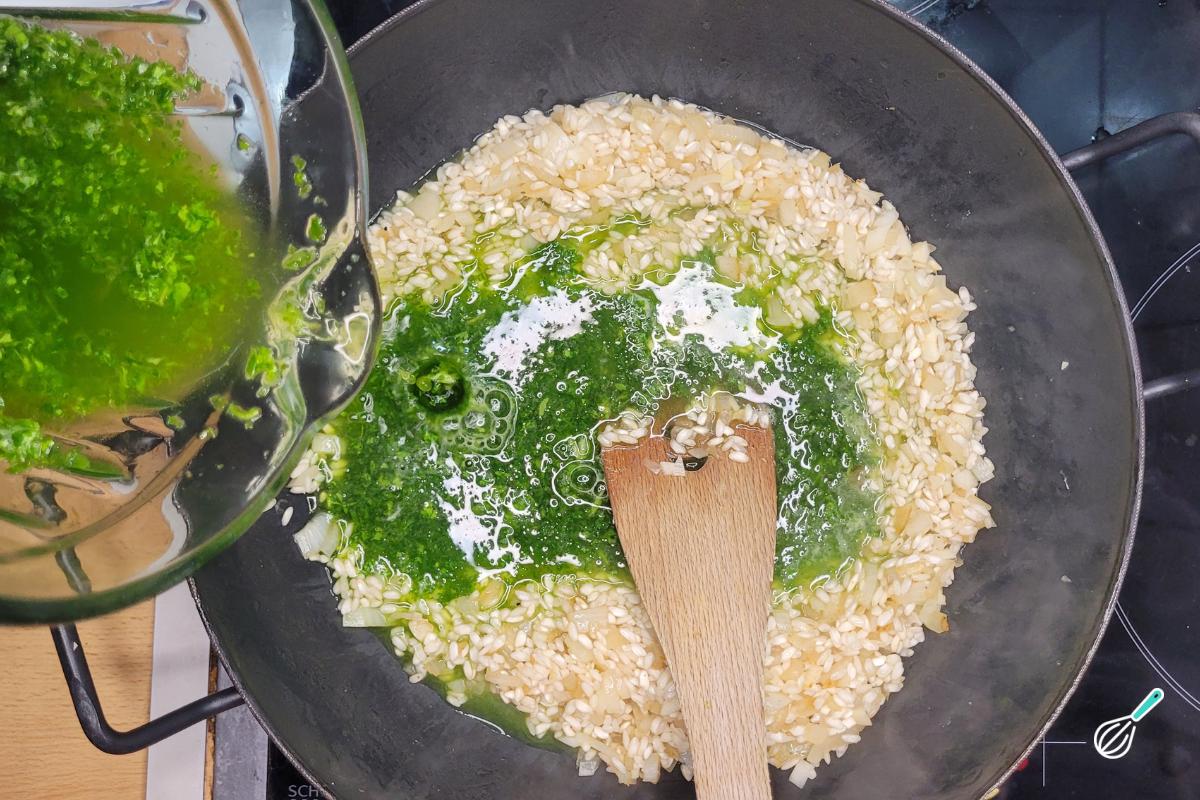 Quando quase toda a água do risoto tiver secado, experimente para ver se está no ponto ou se precisa de mais água.