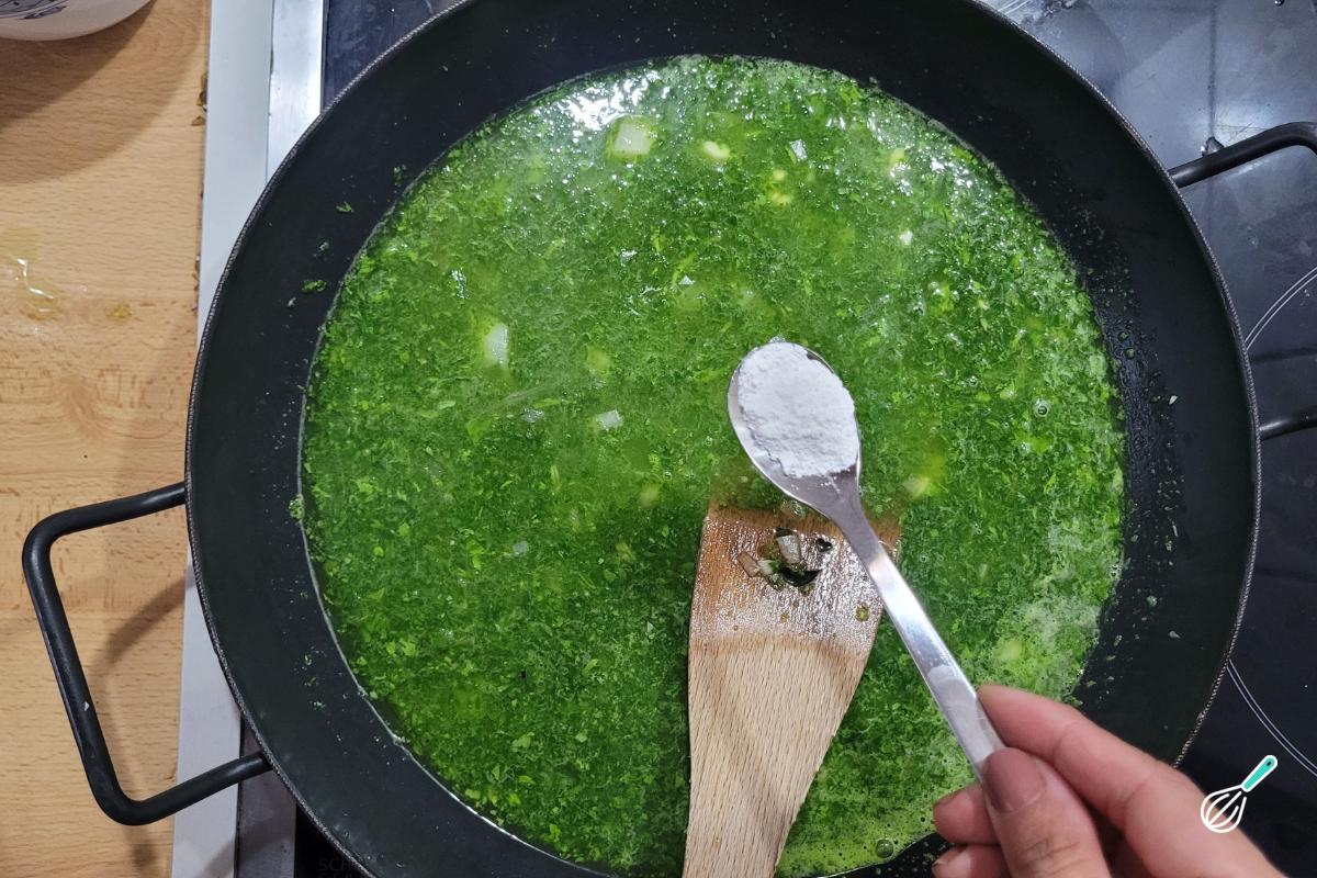 Adicione o bicarbonato de sódio. O bicarbonato intensifica a cor verde para que fique bem brilhante.