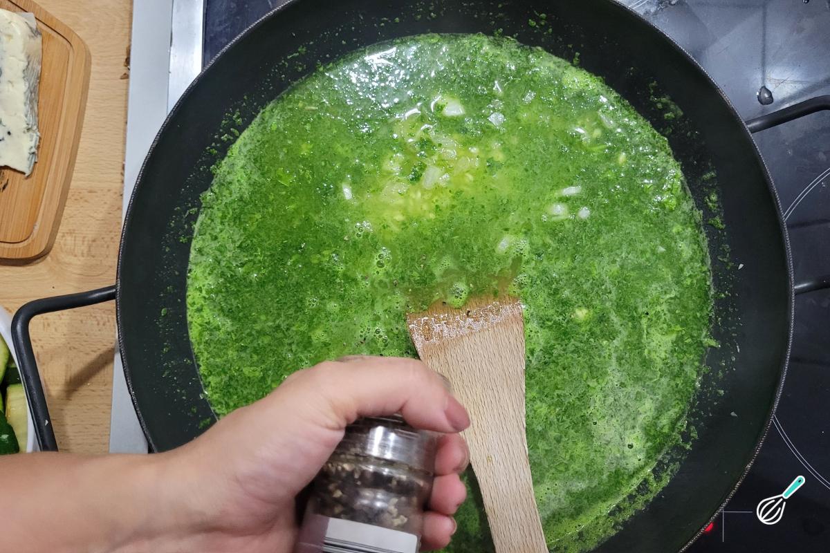 Quando estiver no ponto, volte com a abobrinha e as folhas de espinafre que a gente tinha reservado.